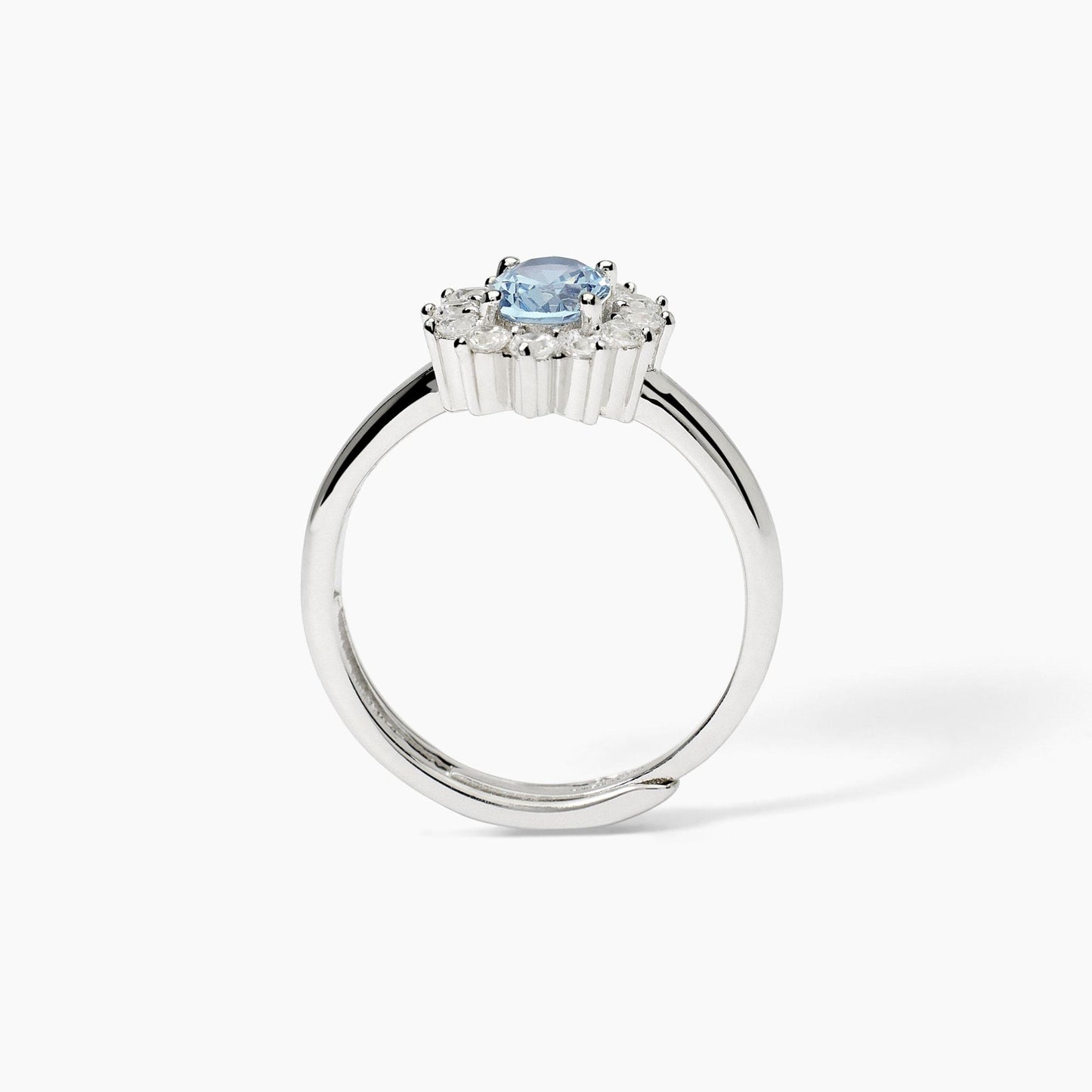 Adjustable women's ring in rhodium-plated silver with oval-cut synthetic aquamarine and white zircons.