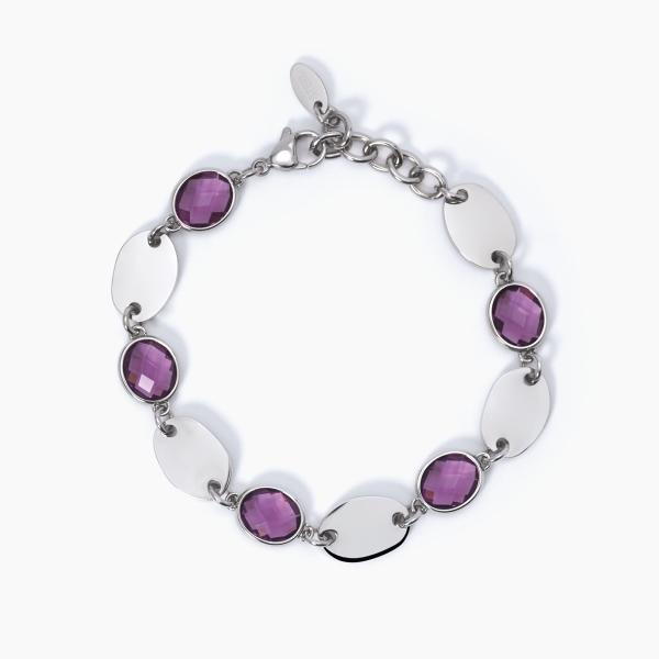 Bracciale in acciaio 316L con catena forzatina 3 mm ed elementi ovali 14.25x9.7, elementi in glass viola 9.65x8.20 mm, lunghezza regolabile da 16.5 a 19.5 cm