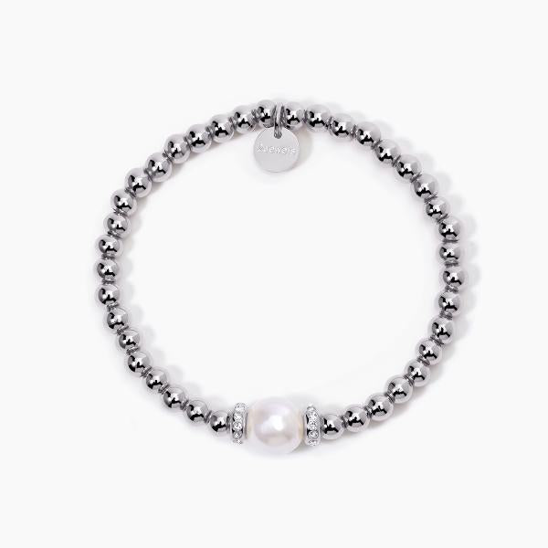Bracciale elastico in acciaio 316L con elementi Ø 5 mm, perla conchiglia Ø 10 mm e cristalli Ø 1.5 mm, lunghezza 17.5 cm