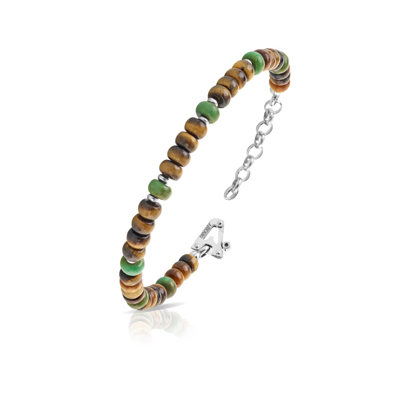 Bracciale uomo in argento 925% con occhio di tigre, turchese verde, rondelle bianche, diamante nero da carati. 0,01. La chiusura ritrae la A di Arkano, impreziosita dal diamante nero. Gli anellini finali permettono di regolarne la lunghezza da cm. 21,5 a cm. 18.