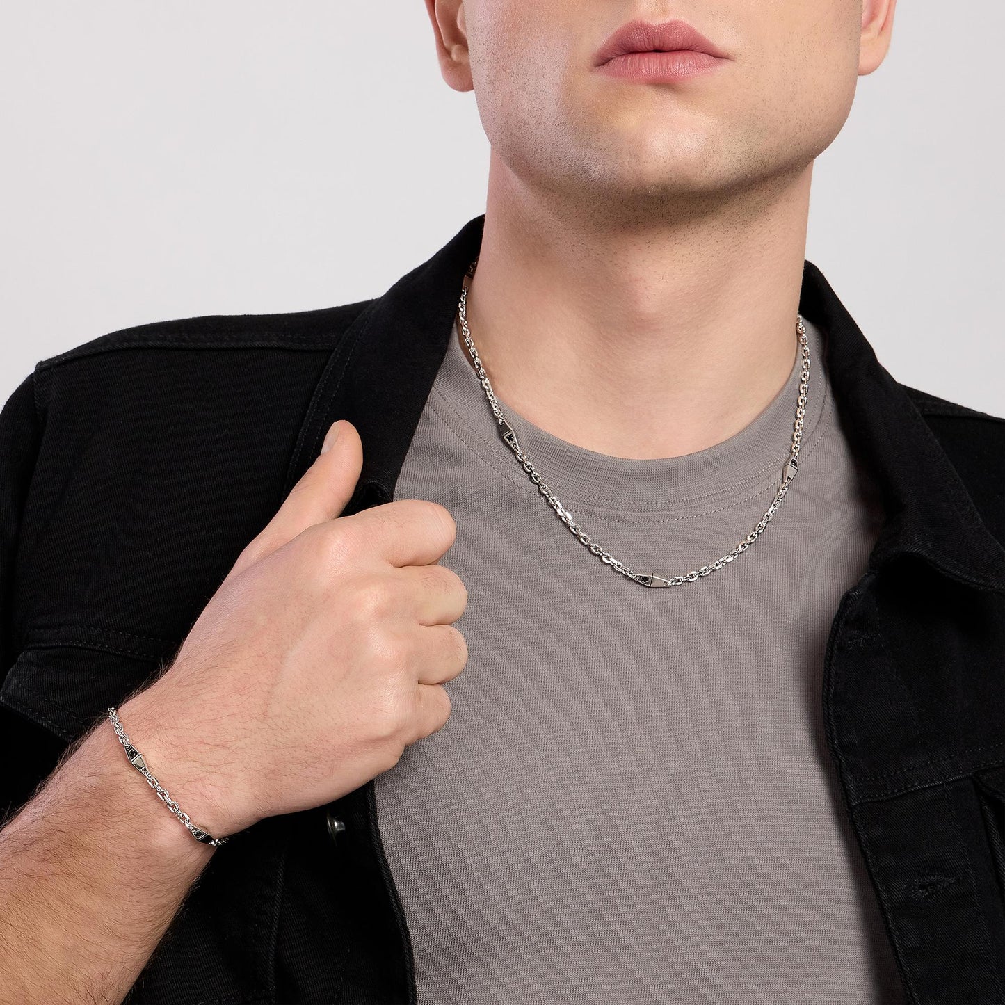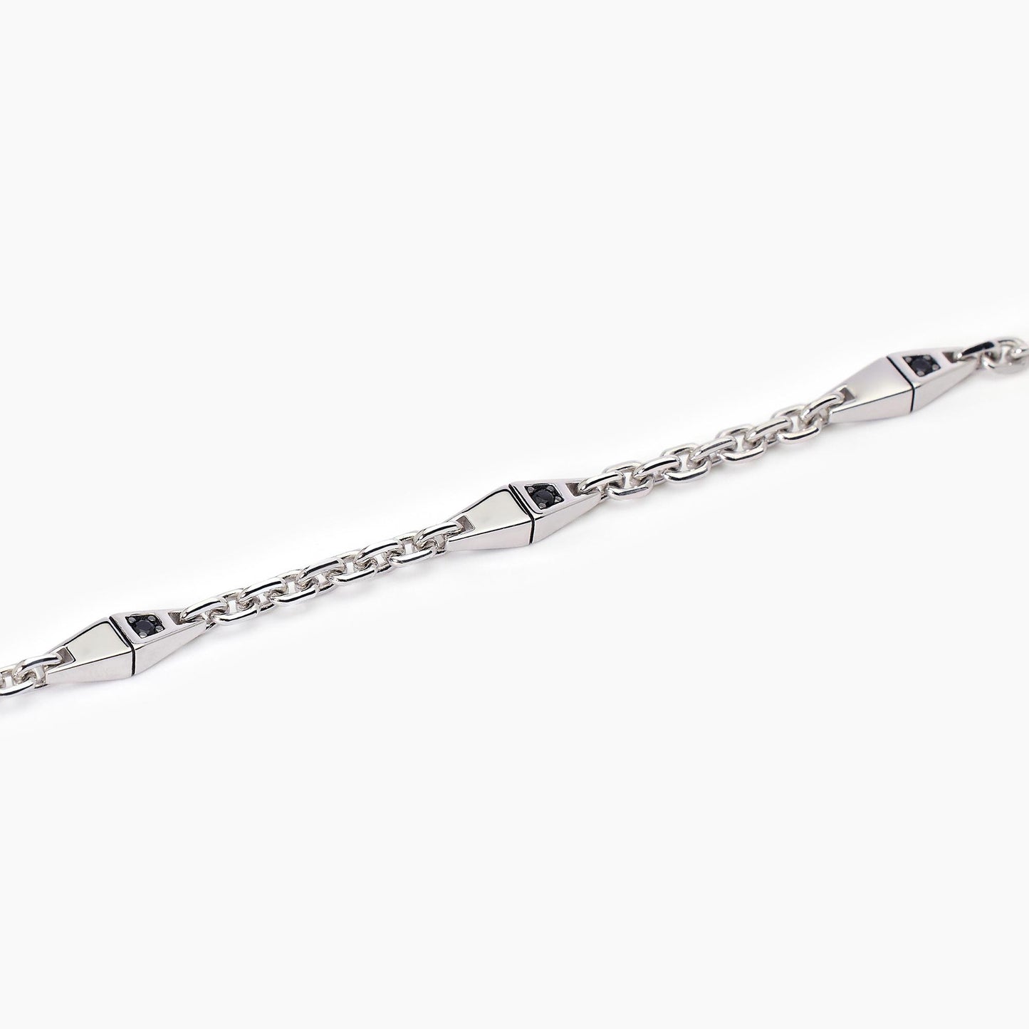 Bracciale da uomo in argento rodiato con catena rolò e inserti con zirconi neri.
