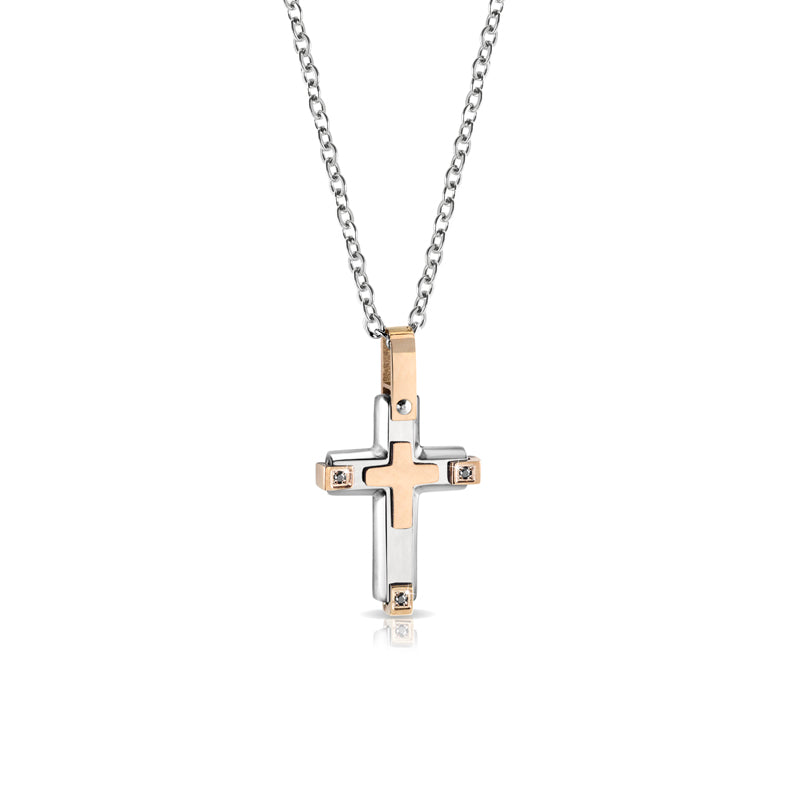 Ciondolo uomo in acciaio 316L con finiture rosè e diamanti neri carati 0,03. La lunghezza della catenina è regolabile da cm. 50 a cm. 45 con chiusura a moschettone