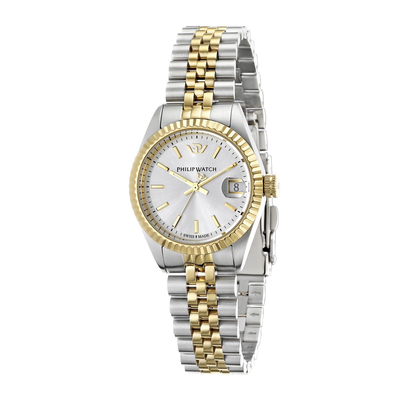 Orologio Philip Watch Caribe, Genere : Donna, Materiale e finitura cassa: Acciaio, Misura cassa: 39x31.3mm, Spessore cassa: 9.15, Colore cassa: Gold, Vetro: Vetro zaffiro, Materiale cinturino: Bracciale in metallo, Colore cinturino: Argento, Oro, Chiusura: Fibbia farfalla con pulsanti & blocco sicurezza, Movimento: Quarzo, Garanzia: Ufficiale 2 anni Philip Watch, Confezione: Originale Philip Watch