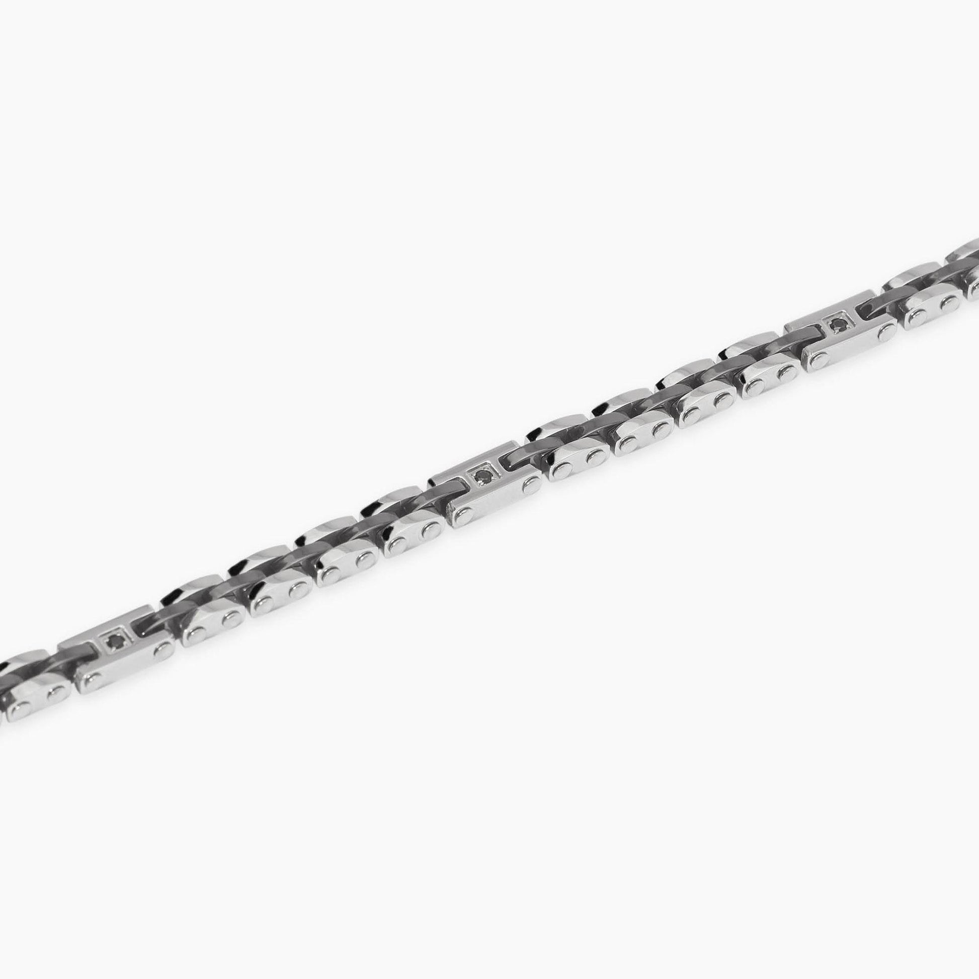 Bracciale regolabile in acciaio con elementi imperniati lucidi e in ceramica nera con cristalli neri.
