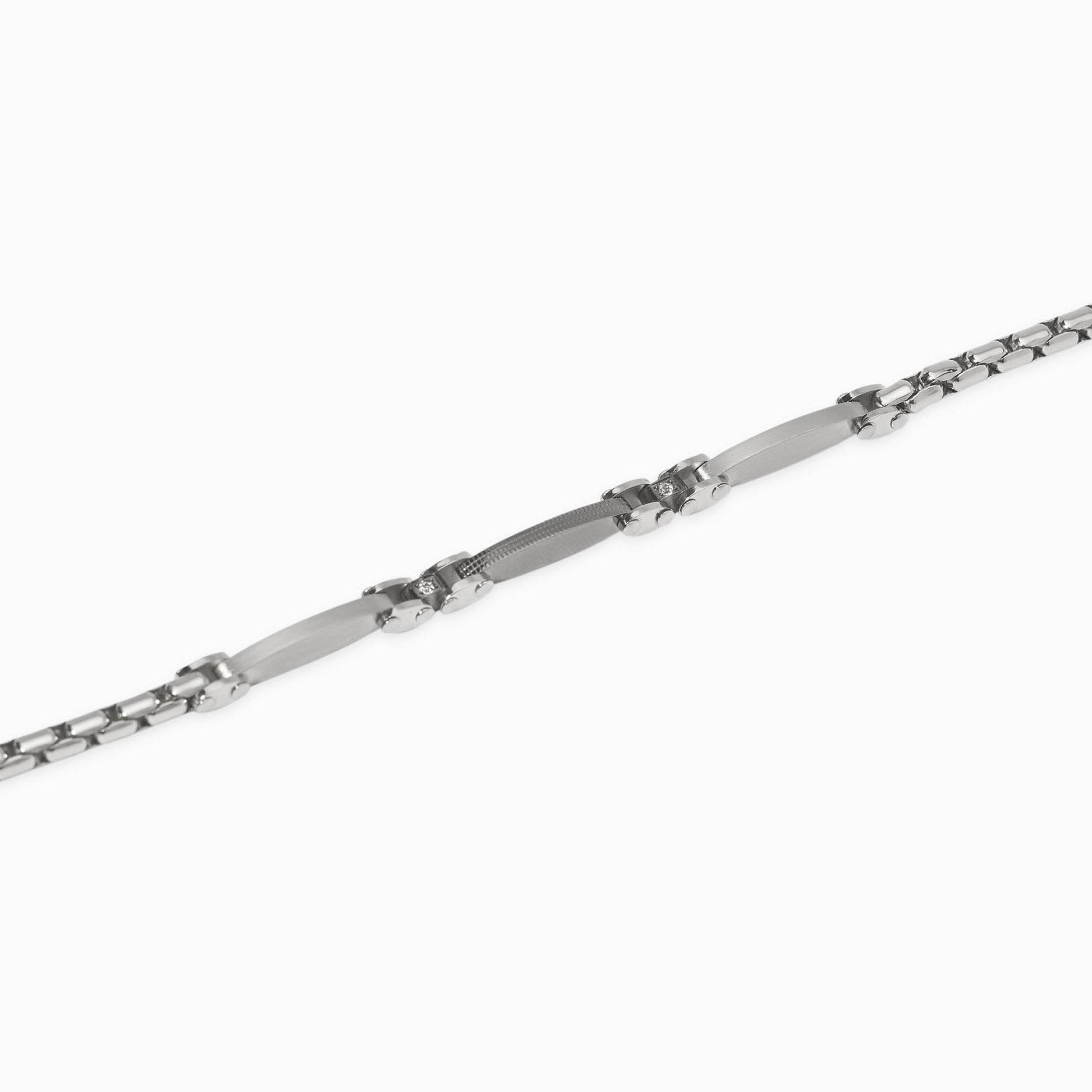 Bracciale regolabile in acciaio lucido e satinato con catena veneta ed elementi in PVD gunmetal con cristalli bianchi.