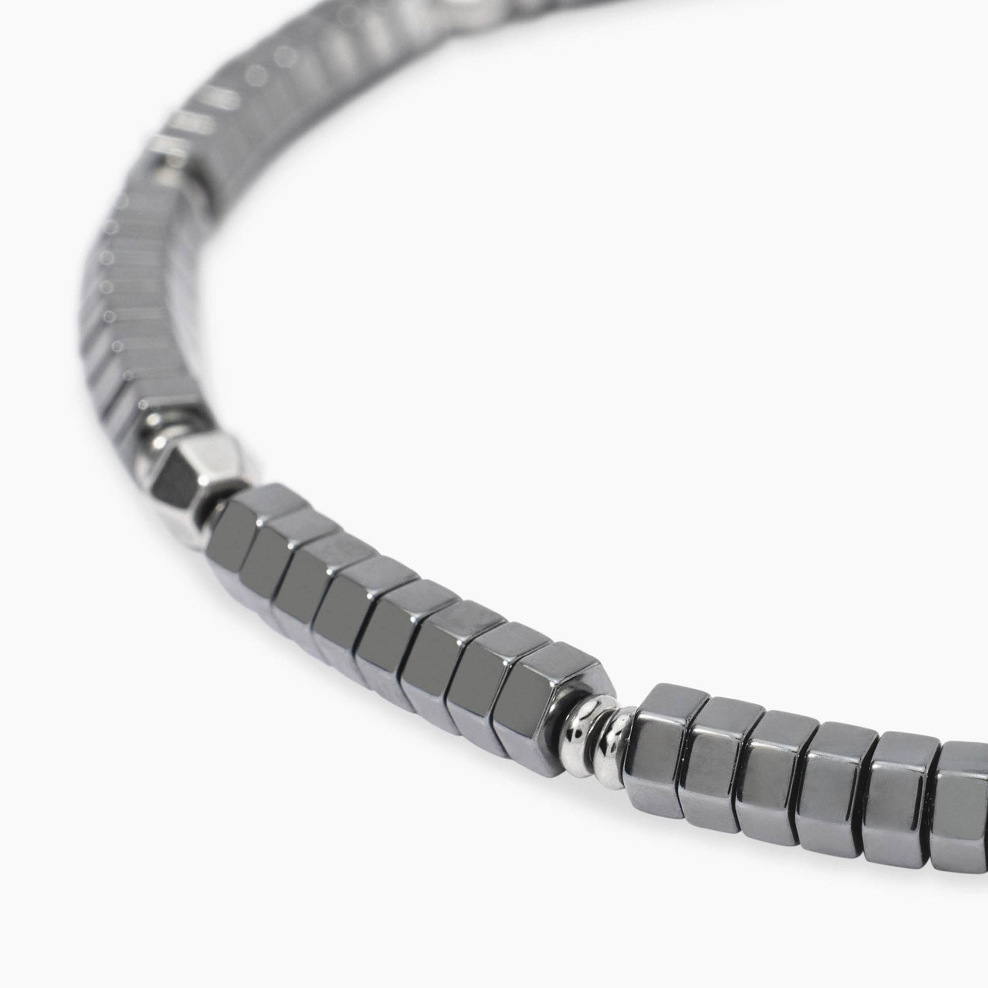 Bracciale regolabile in acciaio con cilindri faccettati ed ematite esagonale.