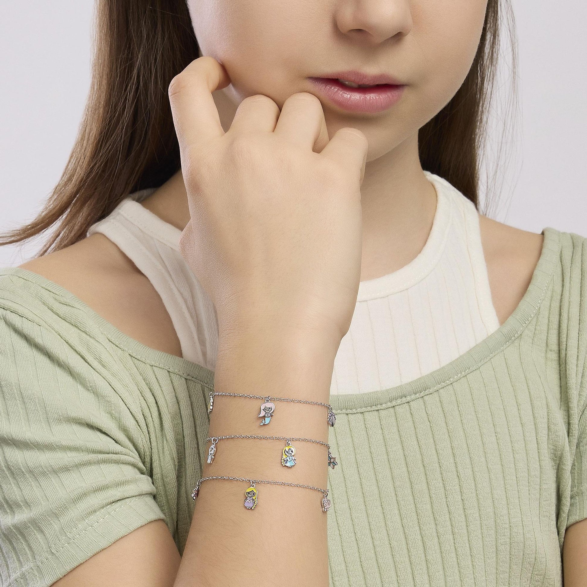 Bracciale regolabile da bambina in argento rodiato con catena forzatina e ciondoli smaltati a forma di fiocco di neve, bambina e pupazzo di neve.