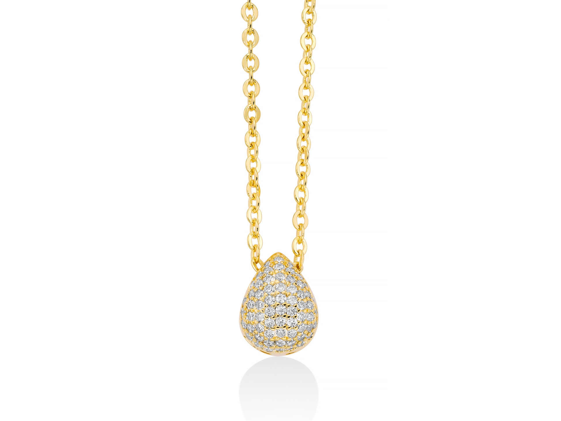 Collana in ottone/acciaio dorato con pendente a goccia e zirconi.