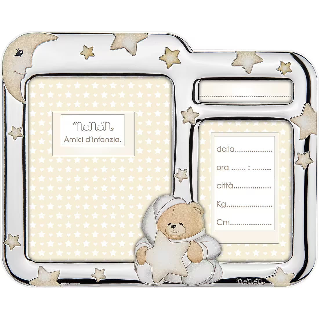 Grazie al design raffinato ed al dolce decoro dell'orsetto Tato in superficie, la cornice Nanan si adatta a qualsiasi stanza o arredamento permettendovi di conservare i vostri ricordi più preziosi accanto a voi.