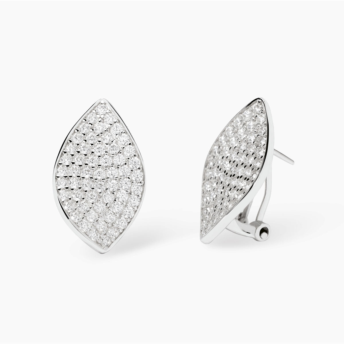 Orecchini in argento rodiato con foglia in pavè di zirconi bianchi.