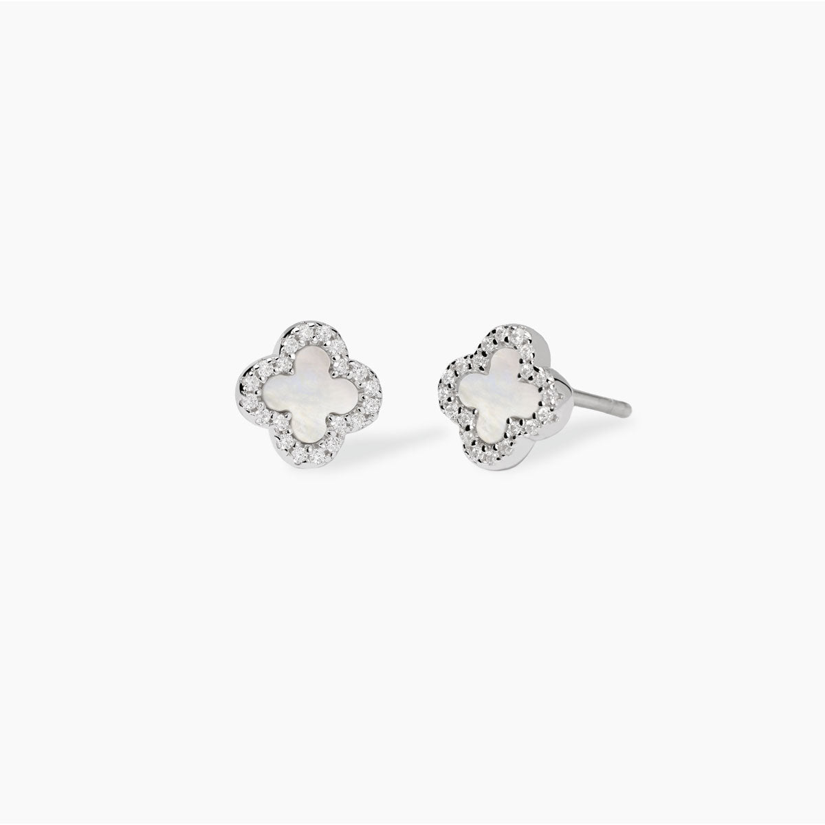 Orecchini in argento 925/°°° rodiato fiore 8x8 mm con madreperla e zirconi Ø 1 mm