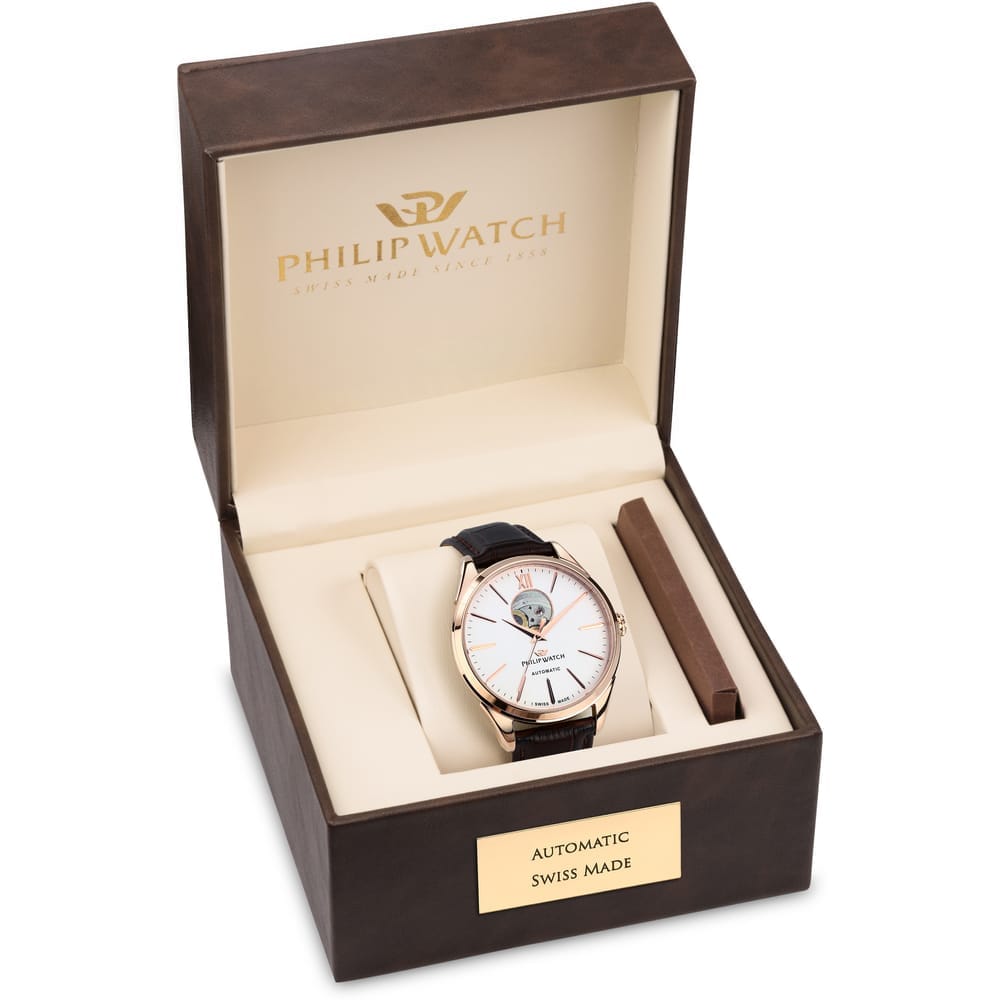 Genere : Uomo, Materiale e finitura cassa: Acciaio, Pelle, Misura cassa: 41mm, Spessore cassa: 10,10, Finitura cassa: Lucido, Colore cassa: Rose-gold, Vetro: Vetro zaffiro, Materiale cinturino: Pelle, Colore cinturino: Marrone, Chiusura: Farfalla con pulsante laterale per cinturini, Swiss made: Sì, Water resistant: 5 atm, Garanzia: Ufficiale 2 anni Philip Watch, Confezione: Originale Philip Watch, Philip Watch experience: Classic