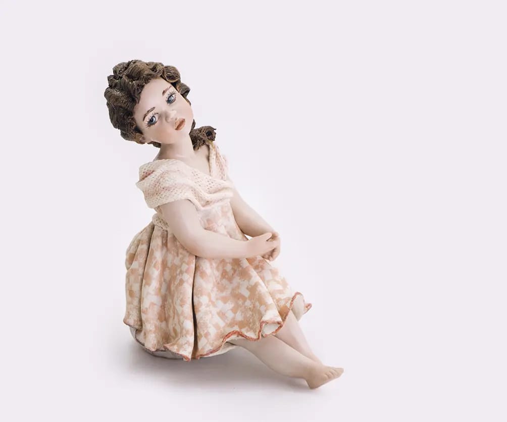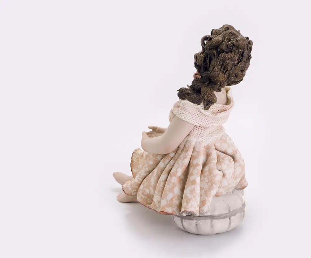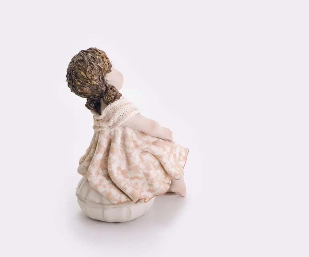 Questa figurina in porcellana rappresenta una ragazza seduta su un pouf tondo grigio perlato, con le gambe stese in avanti elegantemente e le mani raccolte in grembo. Indossa un abito dalla fantasia rosa e bavero in tulle, e porta i capelli raccolti su un spalla.