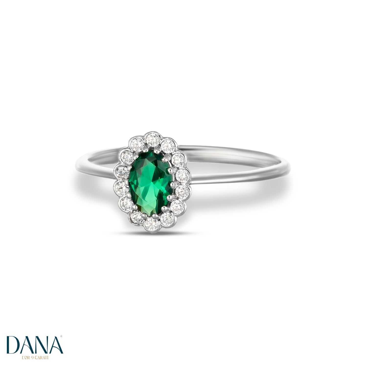 Anello in oro bianco 9kt con cristallo verde centrale e pavé di zirconi. Misura 14