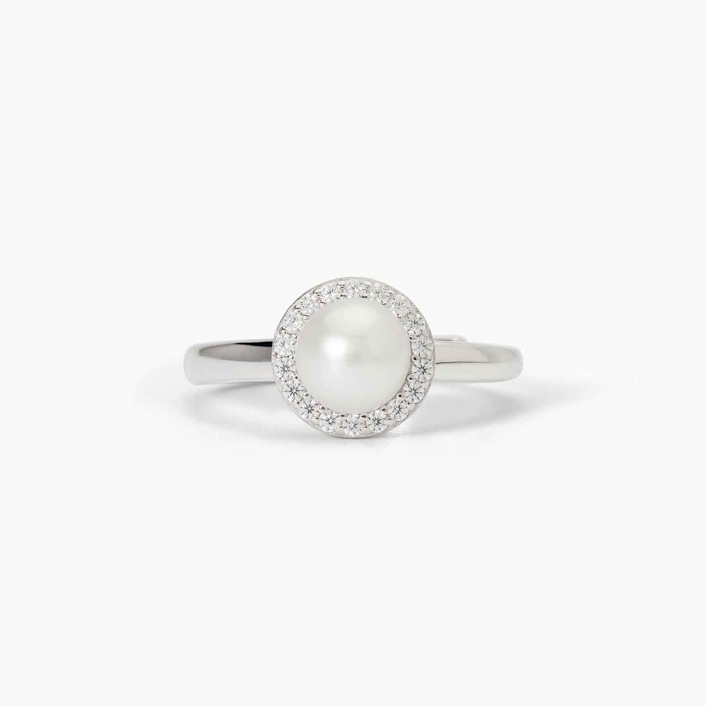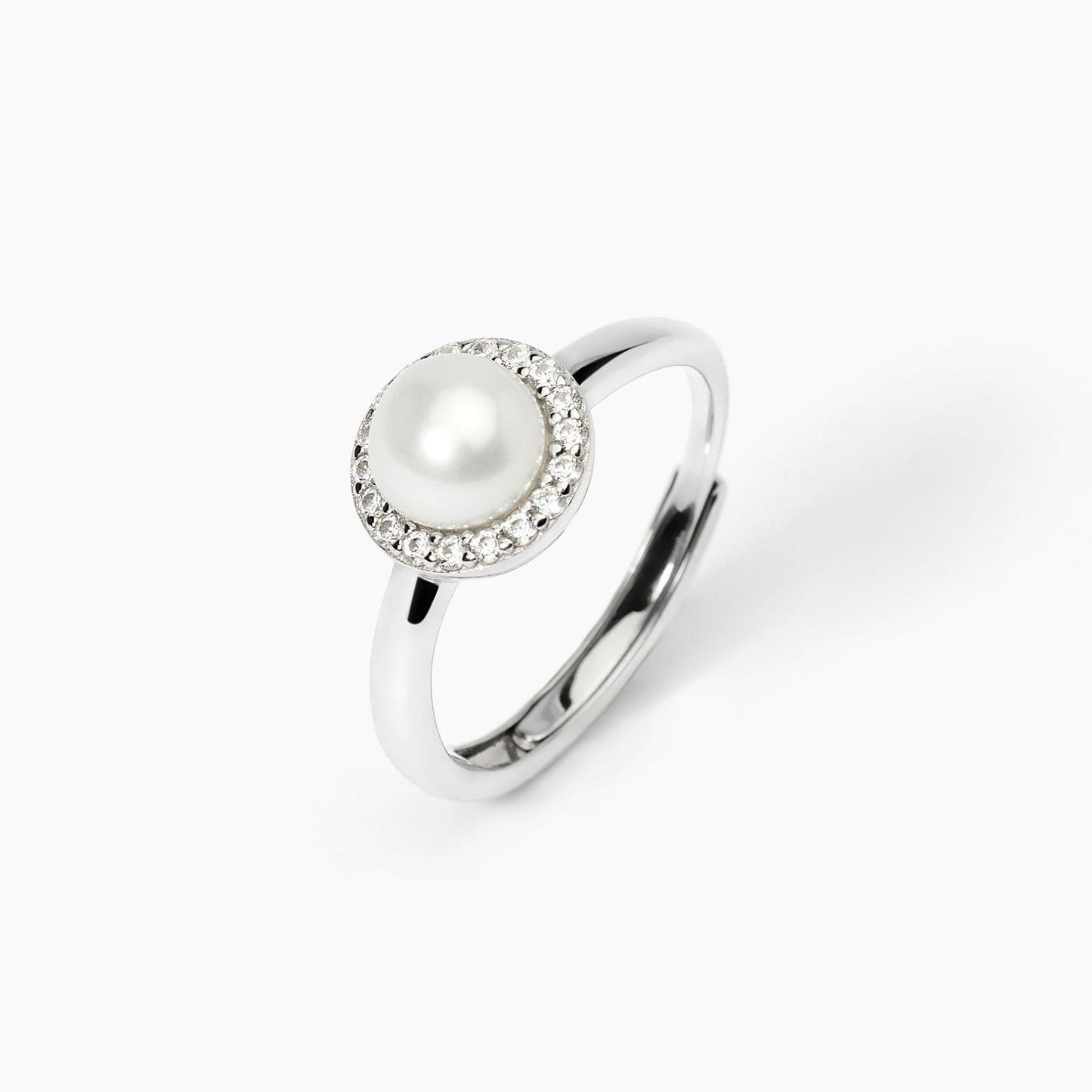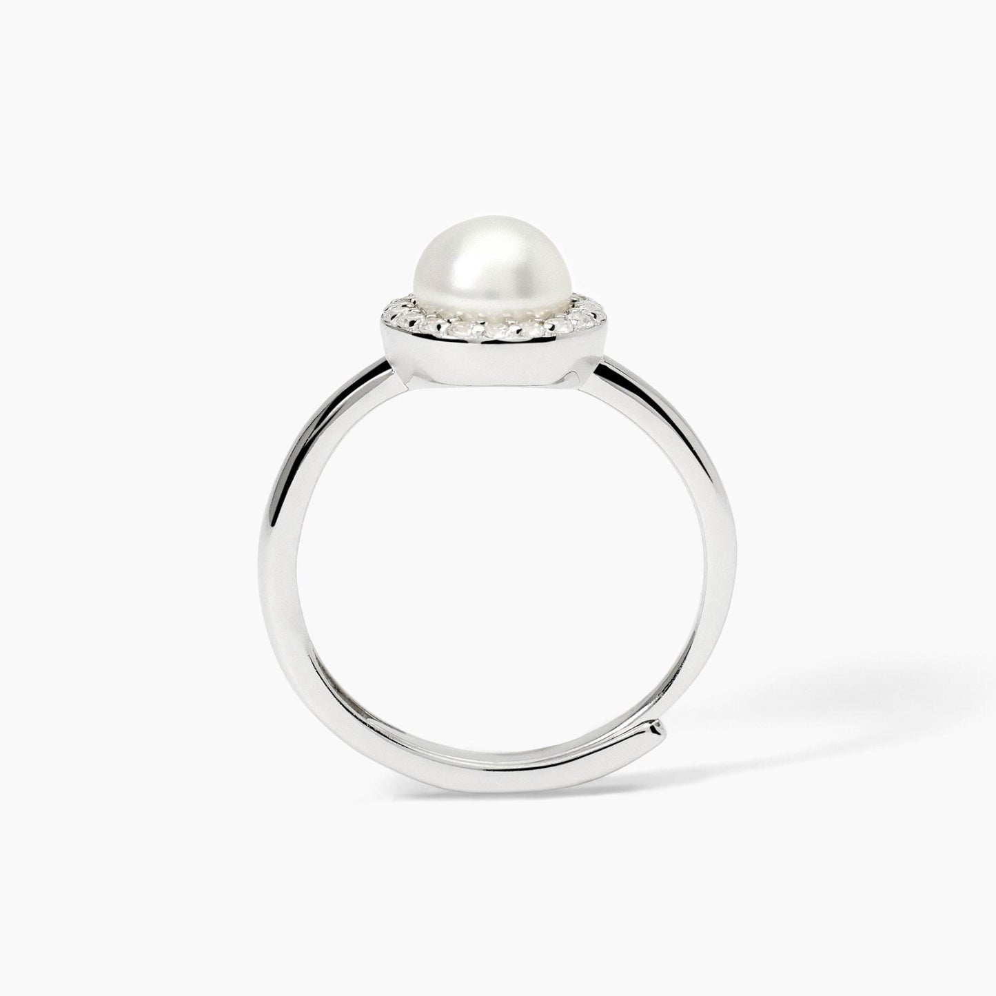 Anello da donna regolabile in argento rodiato con perla coltivata e zirconi bianchi.