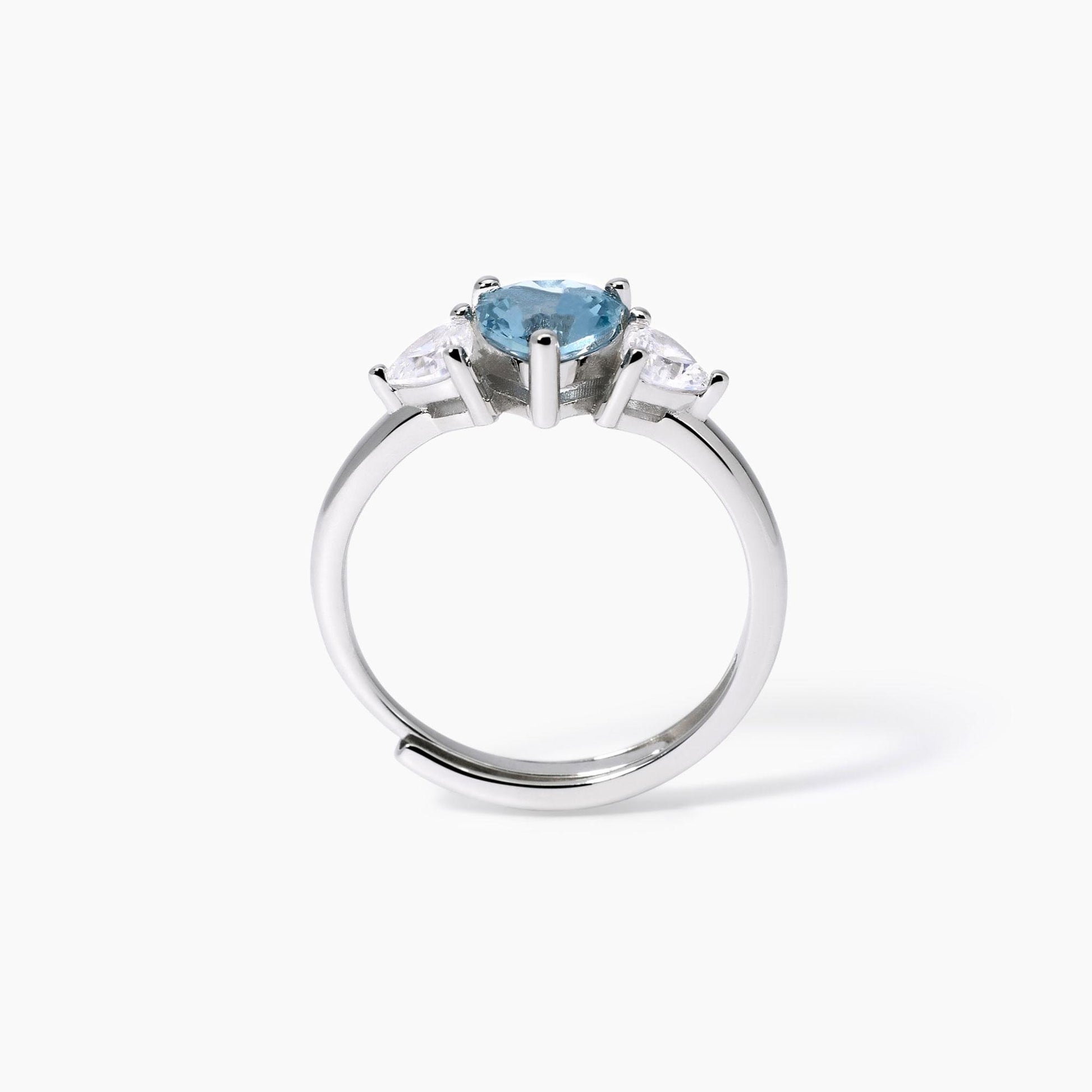 Anello regolabile da donna in argento rodiato con zirconi e acquamarina sintetica taglio cuore.
