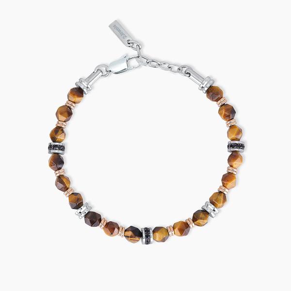 Bracciale in acciaio 316L con elementi Ø 6 mm, elementi in PVD rosé Ø 4 mm, occhio di tigre sfaccettato Ø 6 mm e cristalli neri Ø 1 mm, lunghezza regolabile da 19 a 21 cm