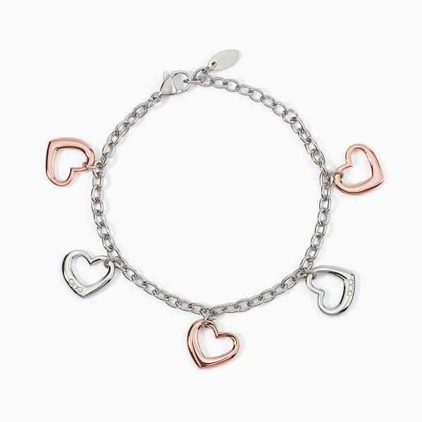 Bracciale in acciaio 316L con catena forzatina 4 mm, ciondoli cuore 14x12.5 mm, ciondoli cuore in PVD rosé 14x12.5 mm e cristalli Ø 1.25 mm lunghezza regolabile da 16 a 19 cm