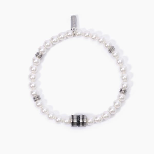 Bracciale in acciaio 316L con elemento 11x9 mm, perla conchiglia Ø 6 mm e cristalli neri Ø 1.5 mm, lunghezza 19.5 cm