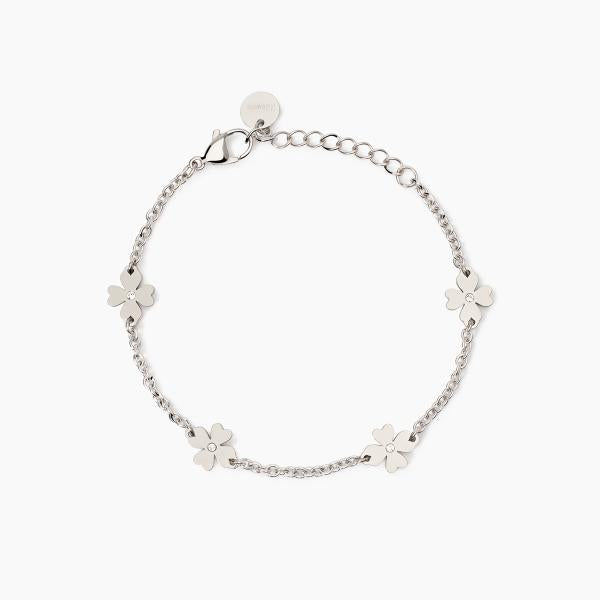 Bracciale in acciaio 316L con catena forzatina 2 mm, elementi quadrifoglio 11x8.5 mm e cristalli Ø 1.5 mm, lunghezza regolabile da 16 a 19 cm