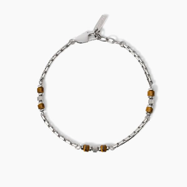Bracciale in acciaio 316L con catena veneta 2.5 mm, sfere 3.7x4 mm e dischi di occhio di tigre 2.5xØ4 mm, lunghezza regolabile da 19 a 21 cm