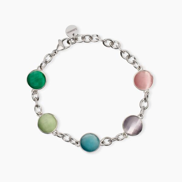 Bracciale in acciaio 316L con catena rolò 5.4 mm e cat eye multicolor sintetico Ø 10 mm taglio briolette, lunghezza 19 cm