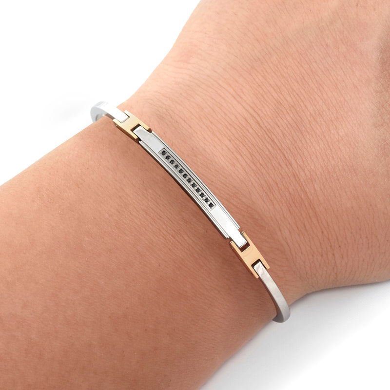 Bracciale uomo in acciaio 316L diamanti neri carati 0,08. La doppia chiusura a scatto permette di regolarne la lunghezza da 19,5 cm a 18 cm.