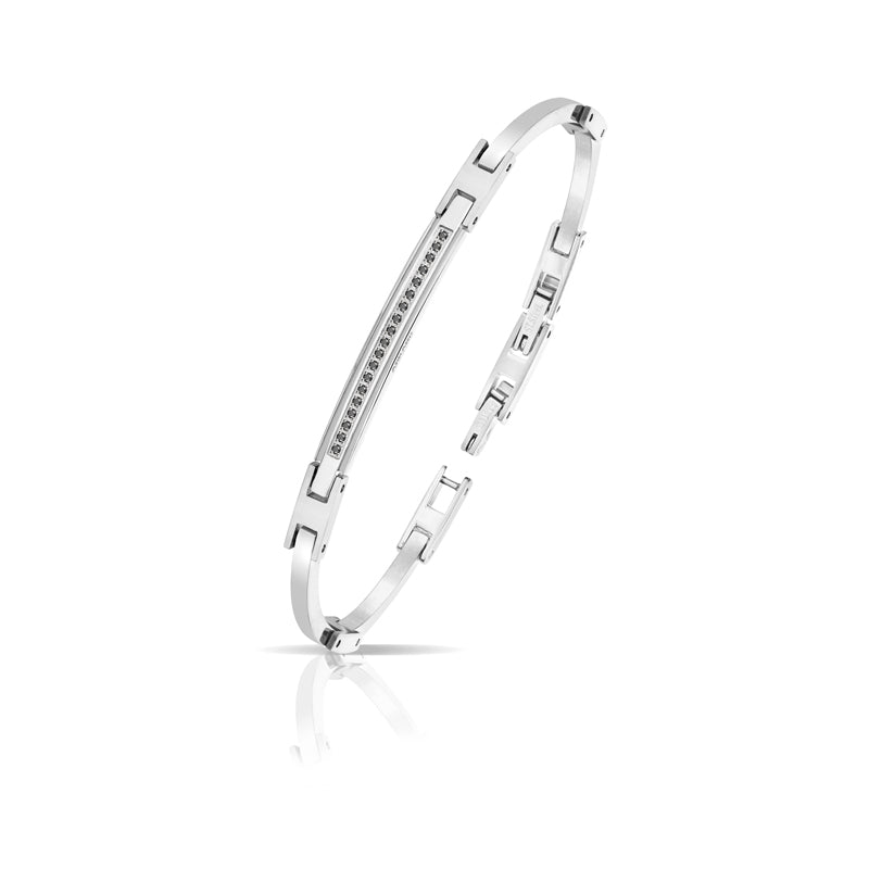 Bracciale uomo in acciaio 316L diamanti neri carati 0,12. La doppia chiusura a scatto permette di regolarne la lunghezza da 19,5 cm a 18 cm.