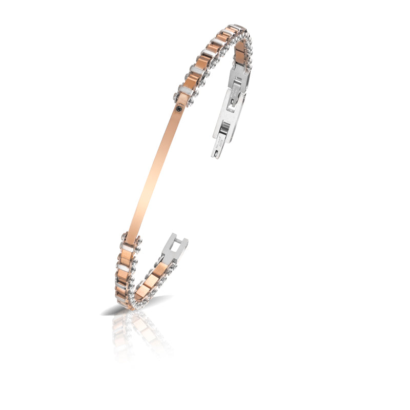 Bracciale uomo in acciaio 316L con piastra centrale e bracciale total rosè e diamante nero carati 0,015. La doppia chiusura a scatto permette di regolarne la lunghezza da 22,5 cm a 21 cm.