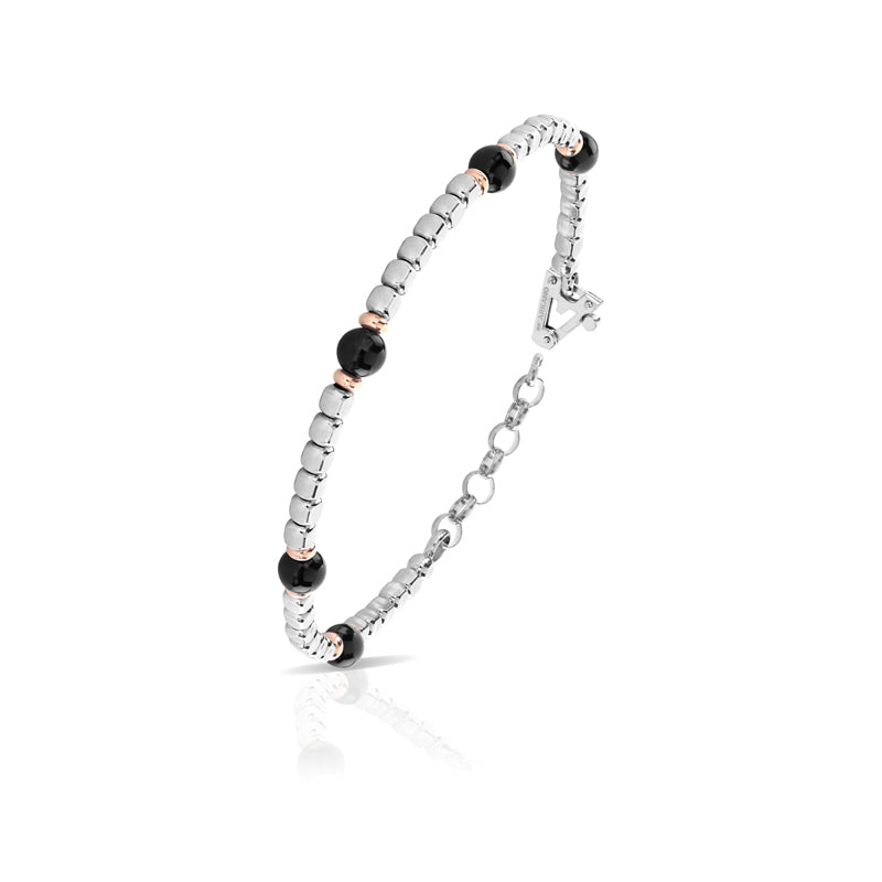 Bracciale uomo in argento 925% con 5 sfere in onice lucido e diamante nero carati 0,01. La chiusura ritrae la A di Arkano, unica nel suo genere anche per la presenza del diamante nero che la impreziosisce. Gli anellini finali permettono di regolarne la lunghezza da cm. 21,5 a cm. 18.
