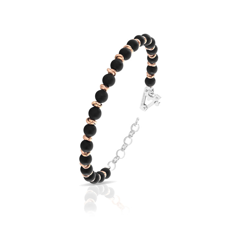 Bracciale uomo in argento 925% con finiture rosè, sfere in onice satinato e diamante nero carati 0,01. Il diamantino nero posto sulla chiusura si sposa perfettamente con i colori riportati su questo magnifico accessorio. Gli anellini finali permettono di regolarne la lunghezza da cm. 21,5 a cm. 18.