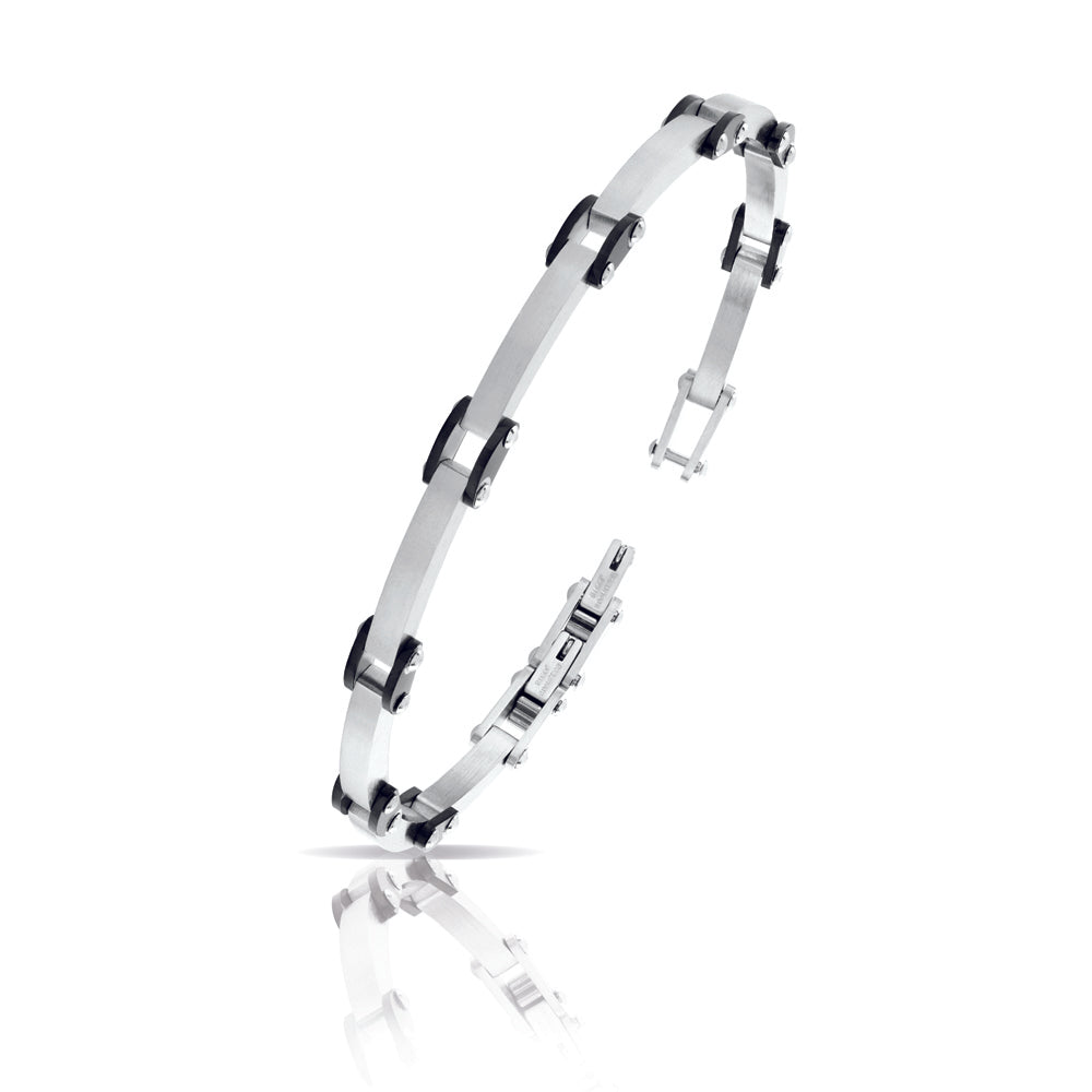 Bracciale uomo in acciaio 316. con finiture black. La doppia chiusura a scatto permette di regolare la lunghezza da cm 21,5 a cm 20,5.