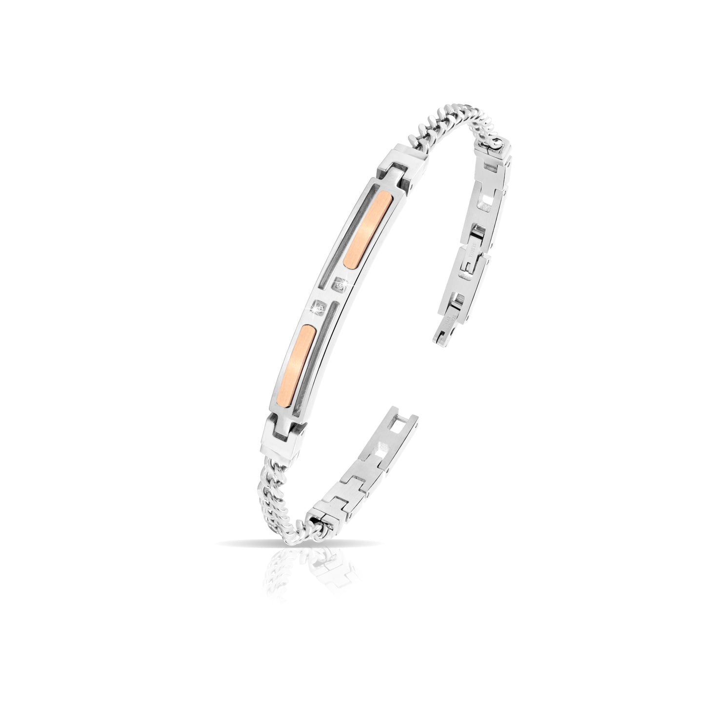 Bracciale uomo in acciaio 316L con finiture rosè e diamanti bianchi carati 0,02. La doppia chiusura a scatto permette di regolarne la lunghezza da cm. 22 a cm. 20,5.