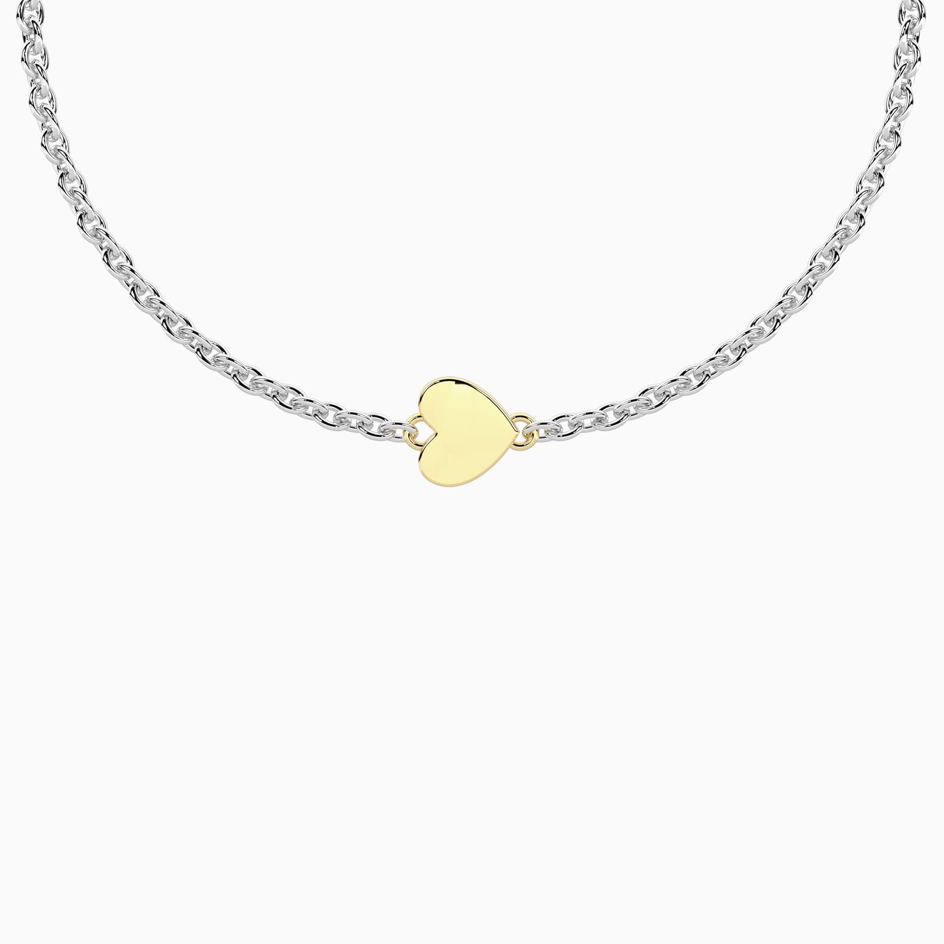 Bracciale unisex con catena forzatina in acciaio taglia 16. Simbolo cuore in oro 9kt e chiusura non-reversibile con simbolo dell'infinito.