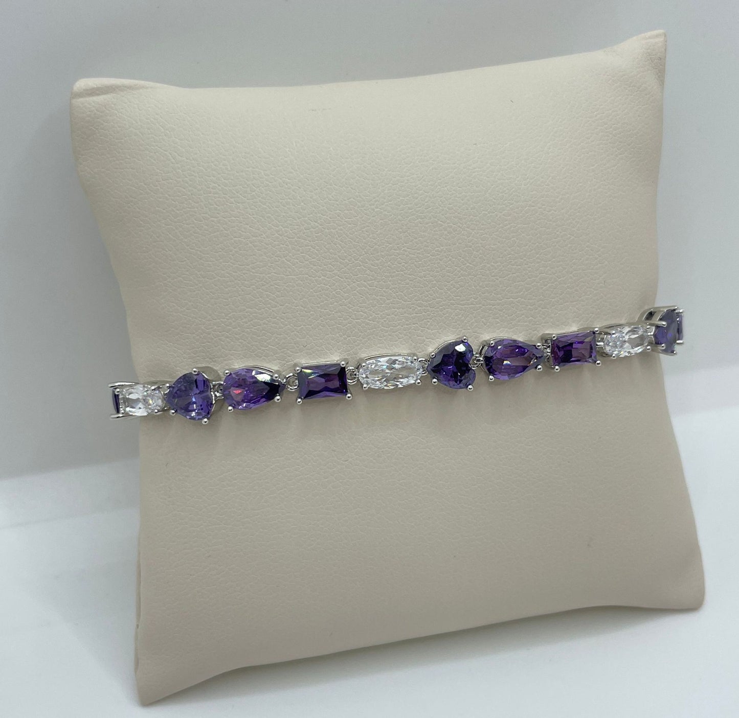 Bracciale in acciaio e ottone con zirconi e cristalli viola e bianchi.