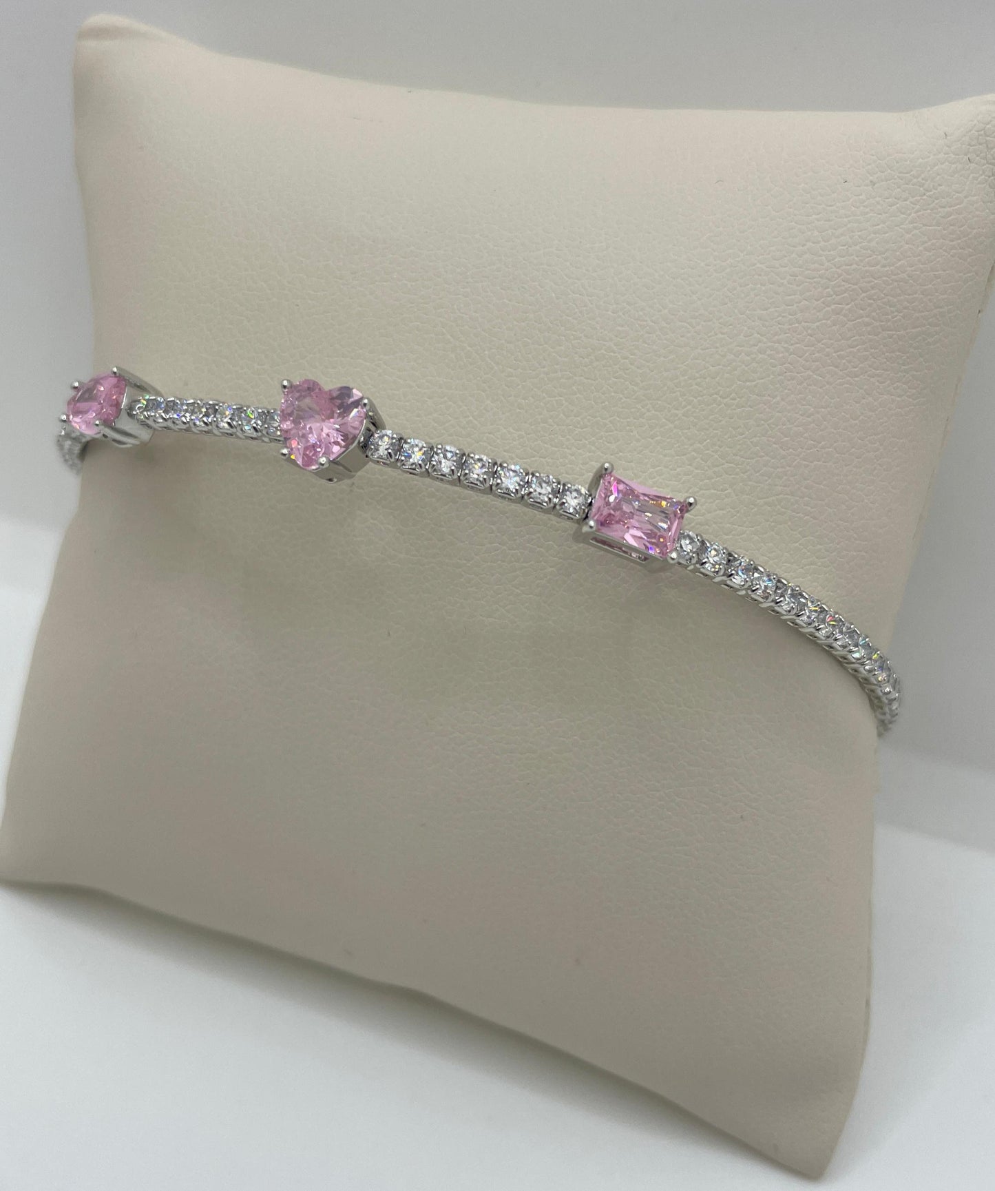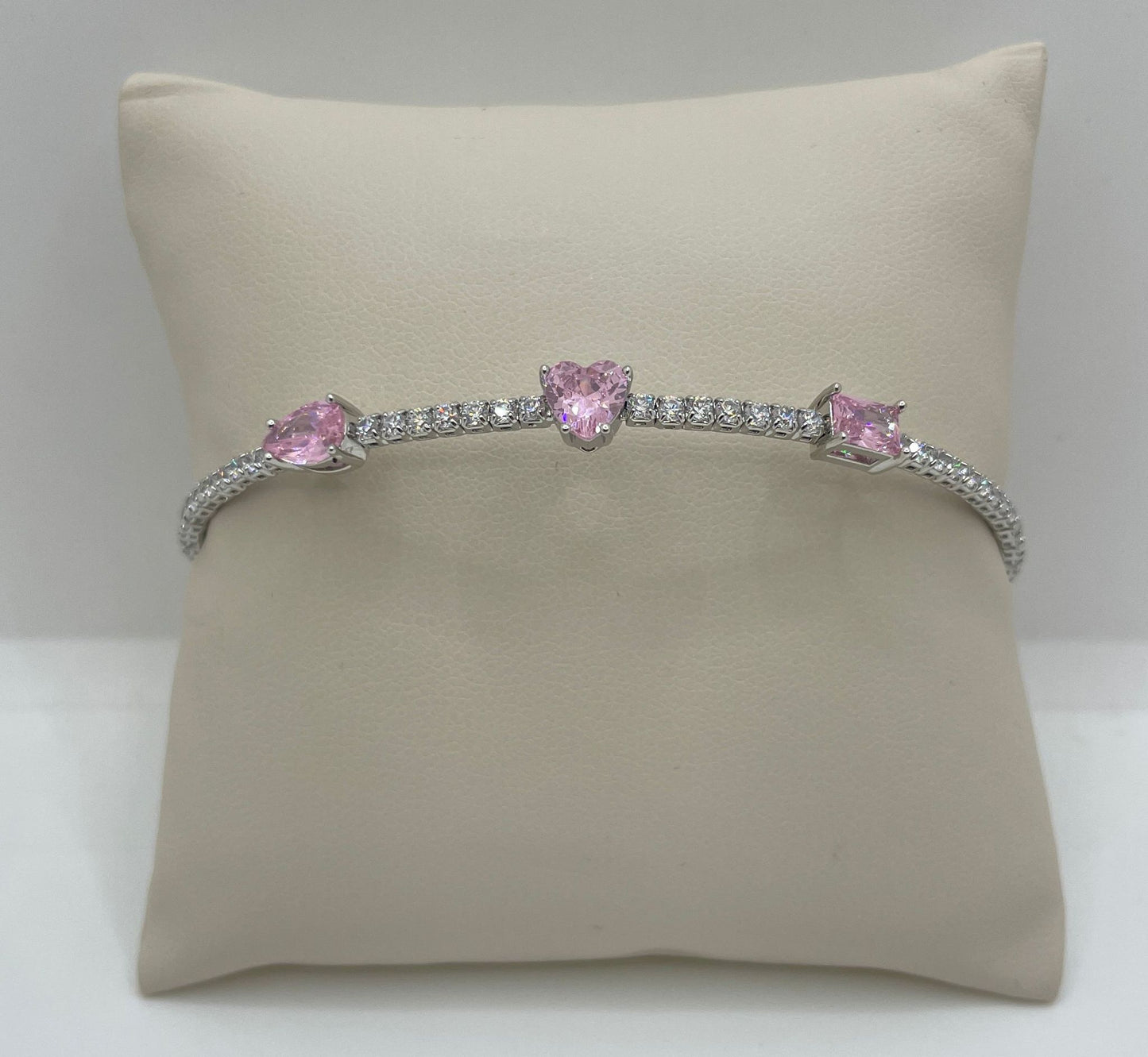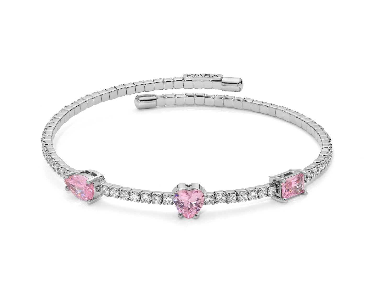 Bracciale in ottone e acciaio con zirconi e cristalli rosa.