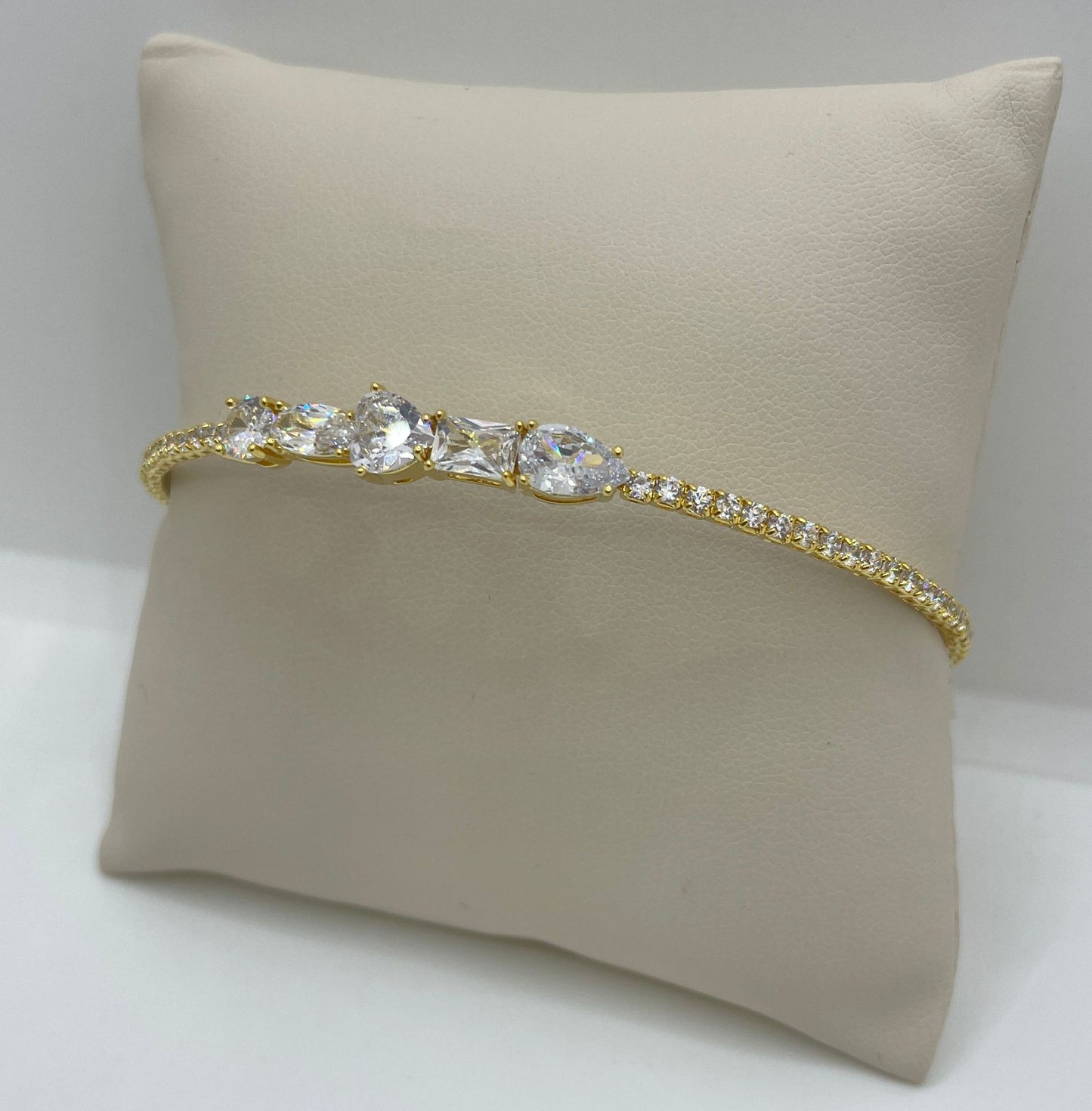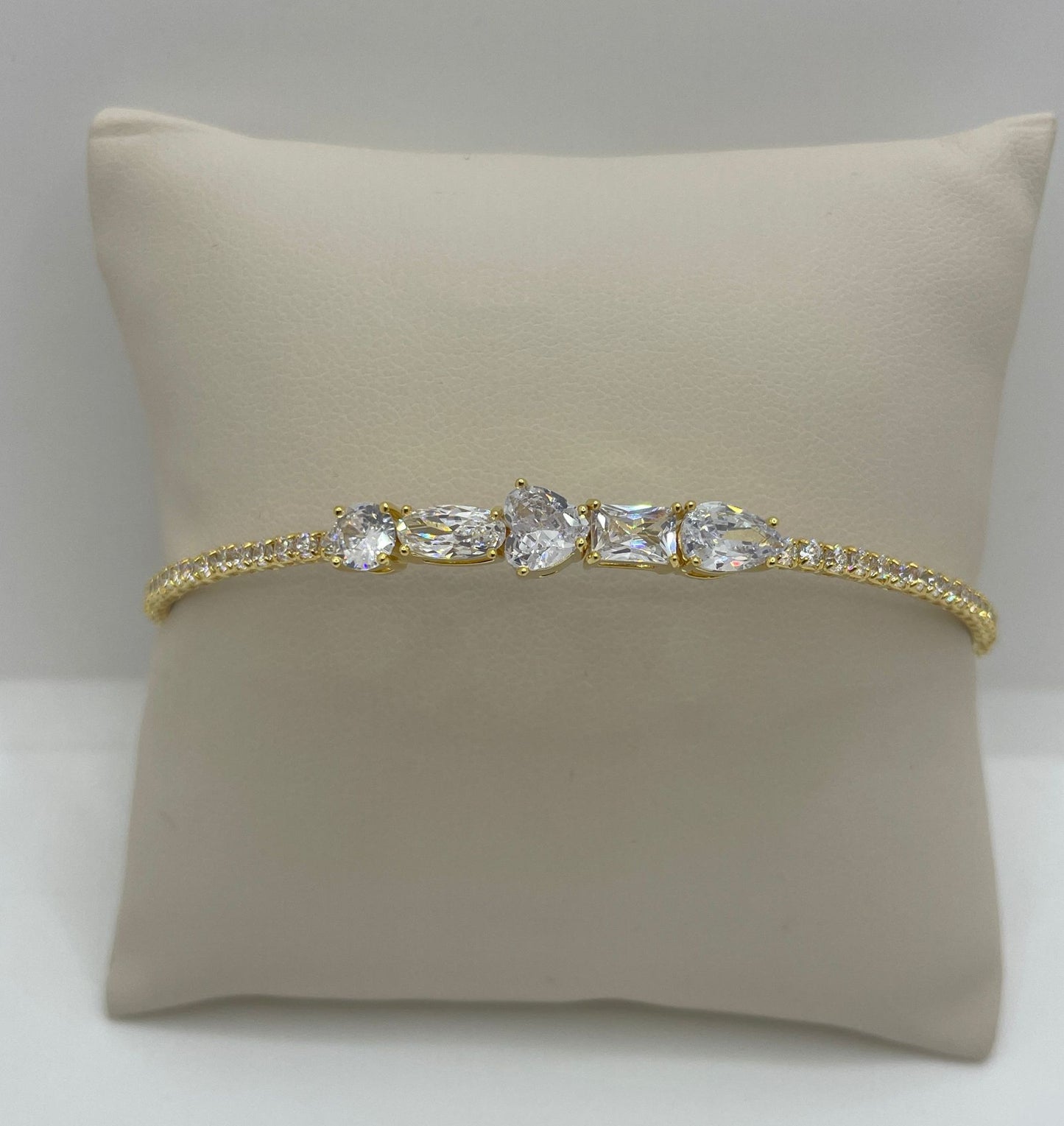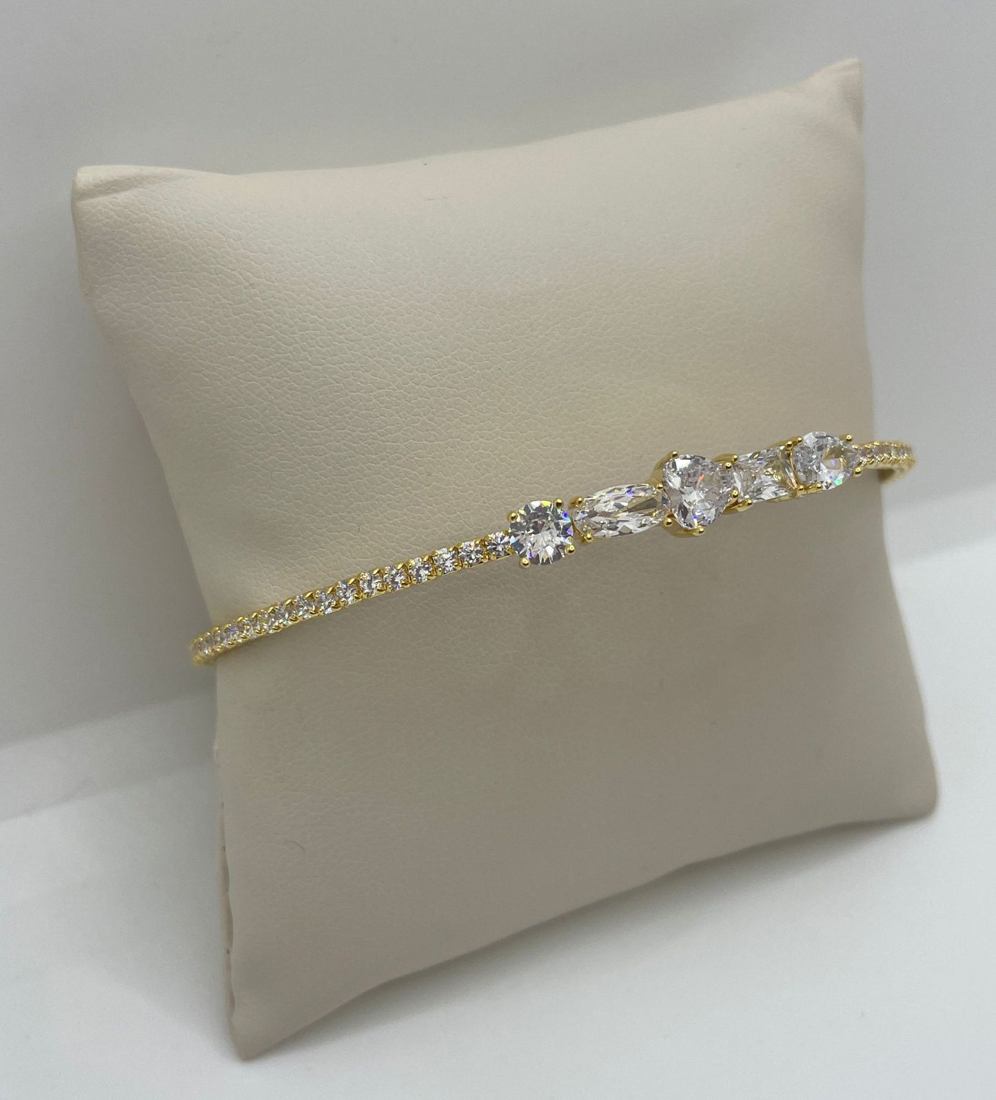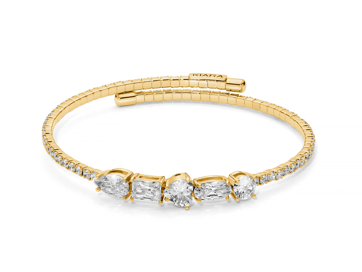 Bracciale in acciaio e ottone con zirconi e cristalli bianchi.