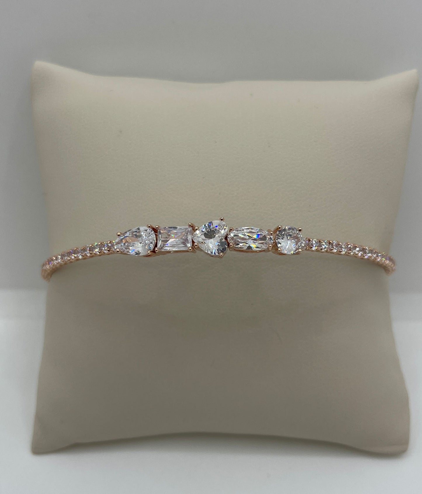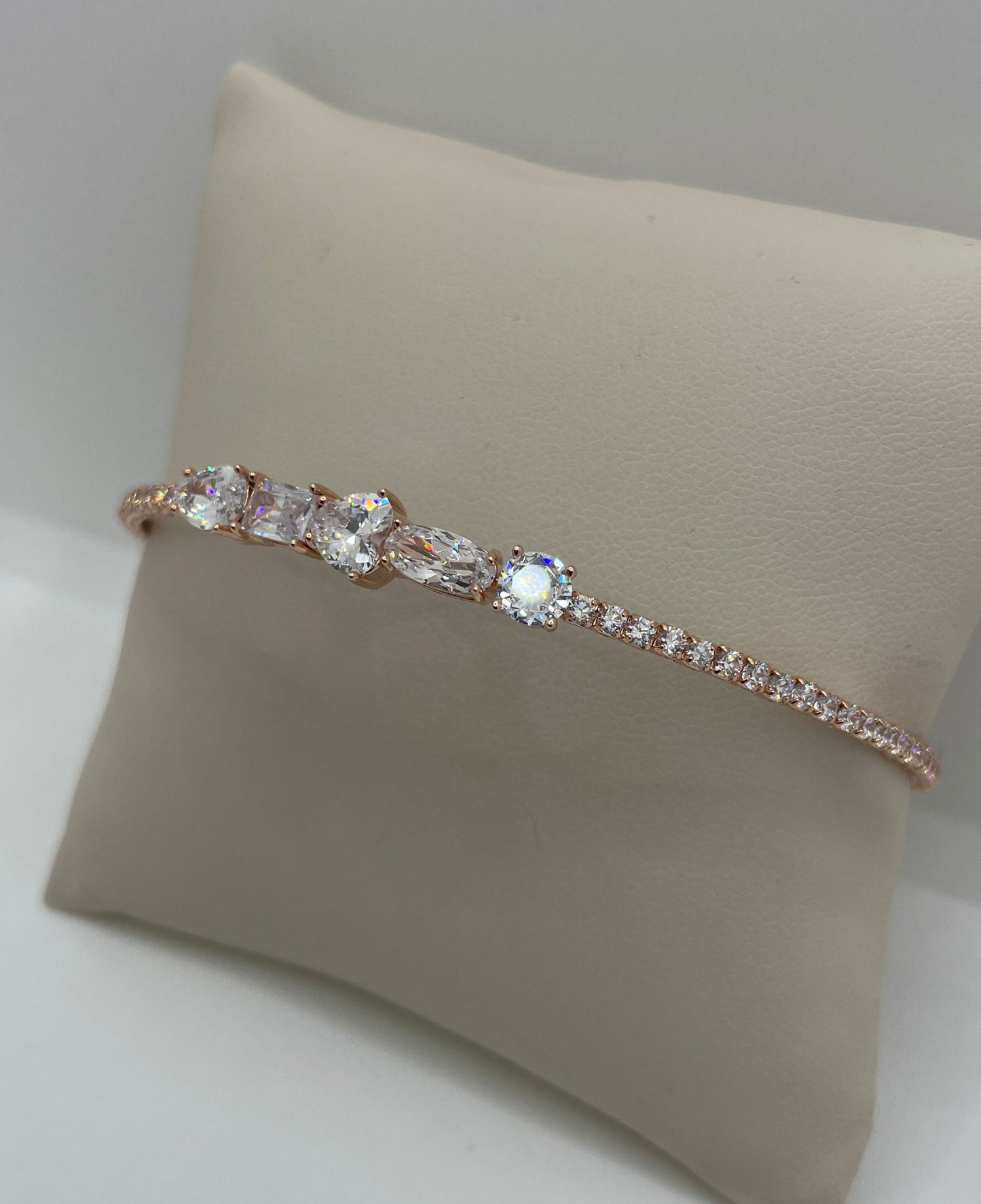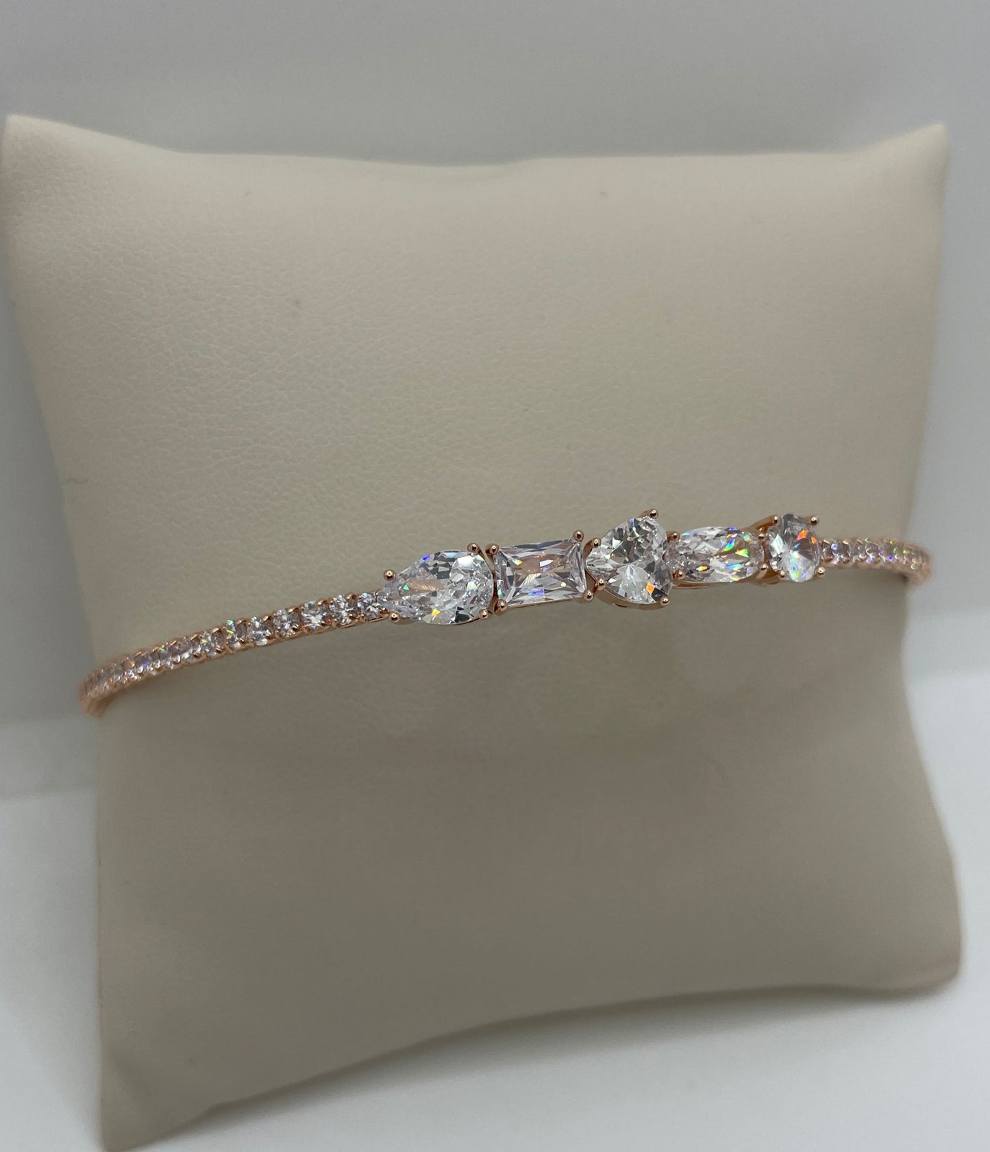 Bracciale in acciaio e ottone con zirconi e cristalli bianchi.