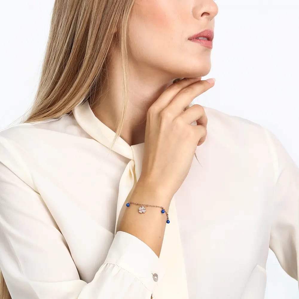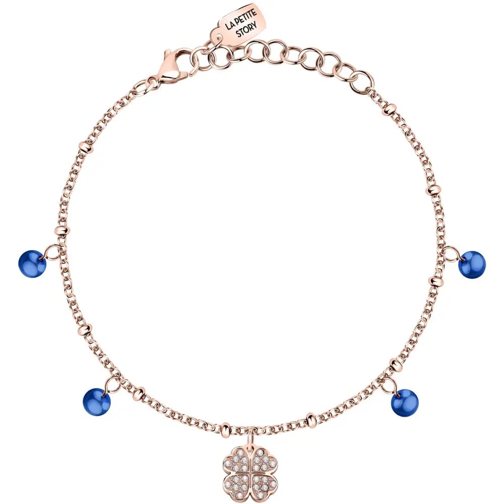Genere: Donna, Misura: 16+3 cm, Colore: Rose-gold, Blu, Materiale: Acciaio, Cristalli, Pietra: Cristallo, Colore pietra: Bianco, Simbolo: Quadrifoglio, Certificato di autenticità: Sì, Confezione: Originale La Petite Story