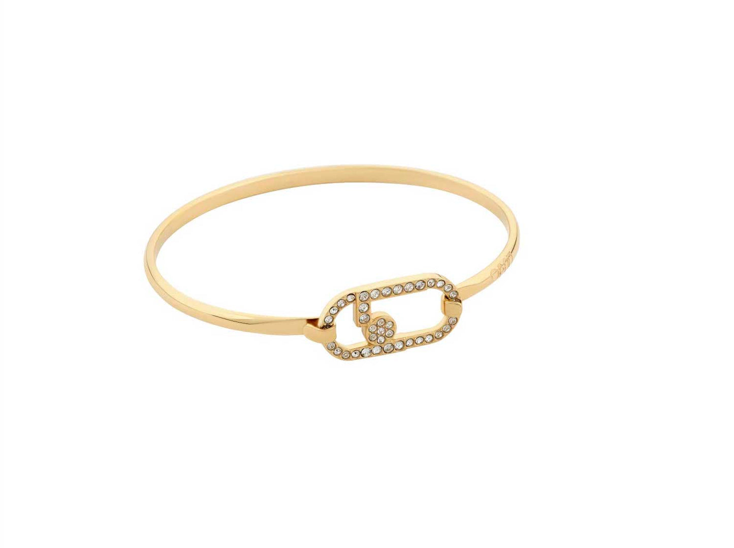 Bracciale da donna realizzato in acciaio di colore oro impreziosito da zirconi. Diametro: 6 cm.