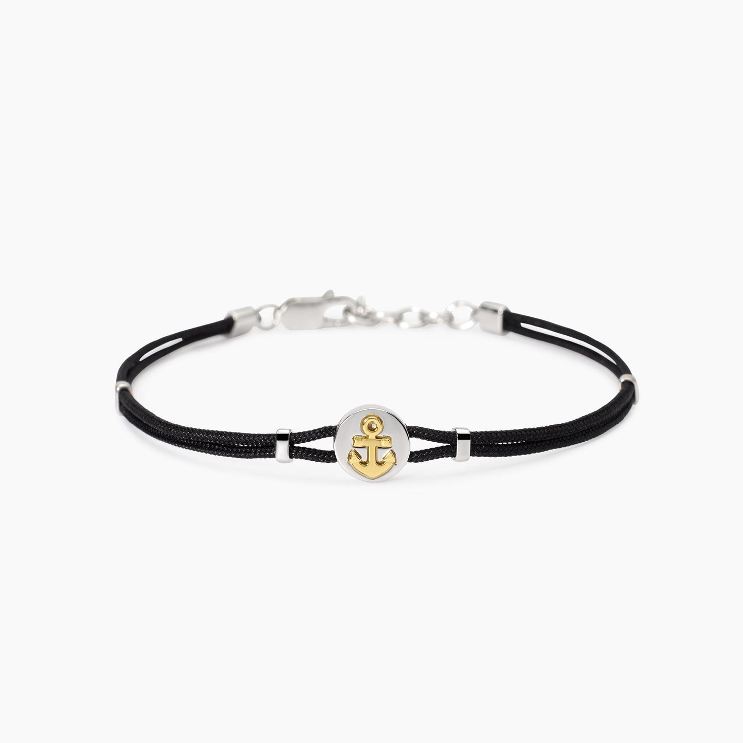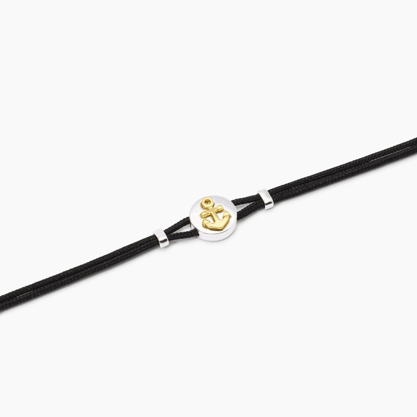 Bracciale regolabile da uomo in argento rodiato con cordino in nylon nero ed elemento ancora placcato oro.