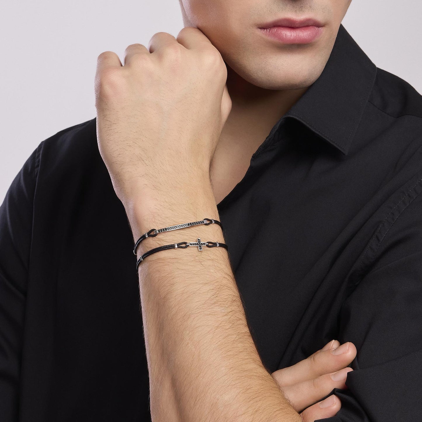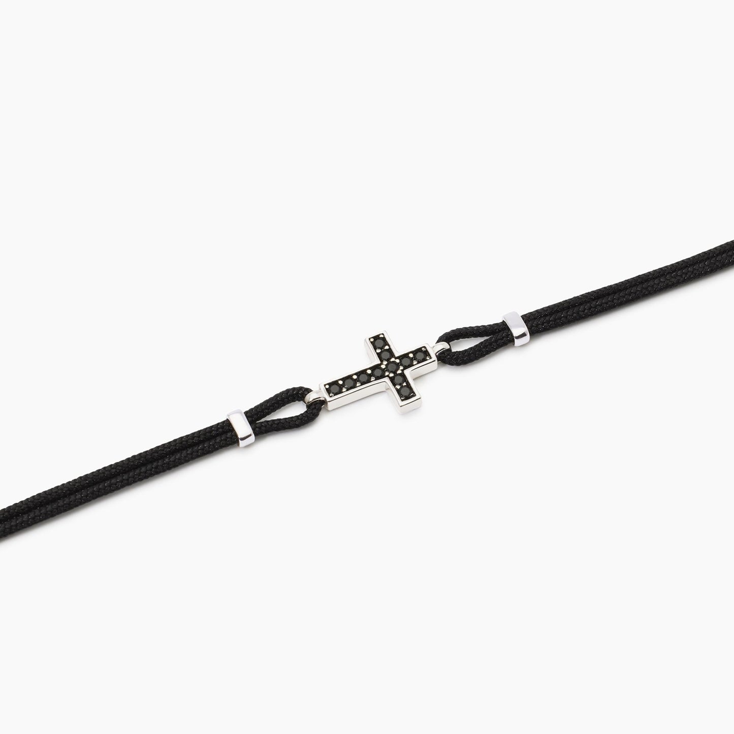 Bracciale regolabile da uomo in argento rodiato con cordino in nylon nero ed elemento croce con zirconi neri.