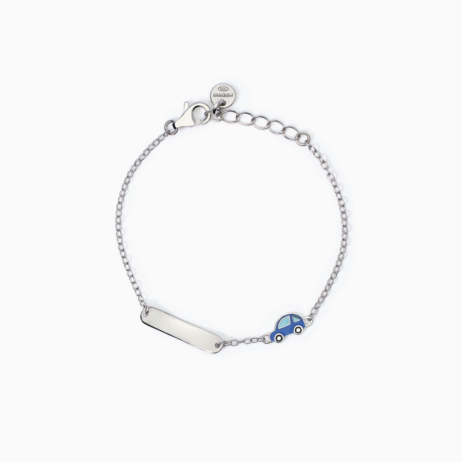 Bracciale regolabile da bambini in argento rodiato con catena forzatina, targhetta centrale e macchinina smaltata. Il bracciale presenta una targhetta centrale sulla quale è possibile incidere date, iniziali o nomi.