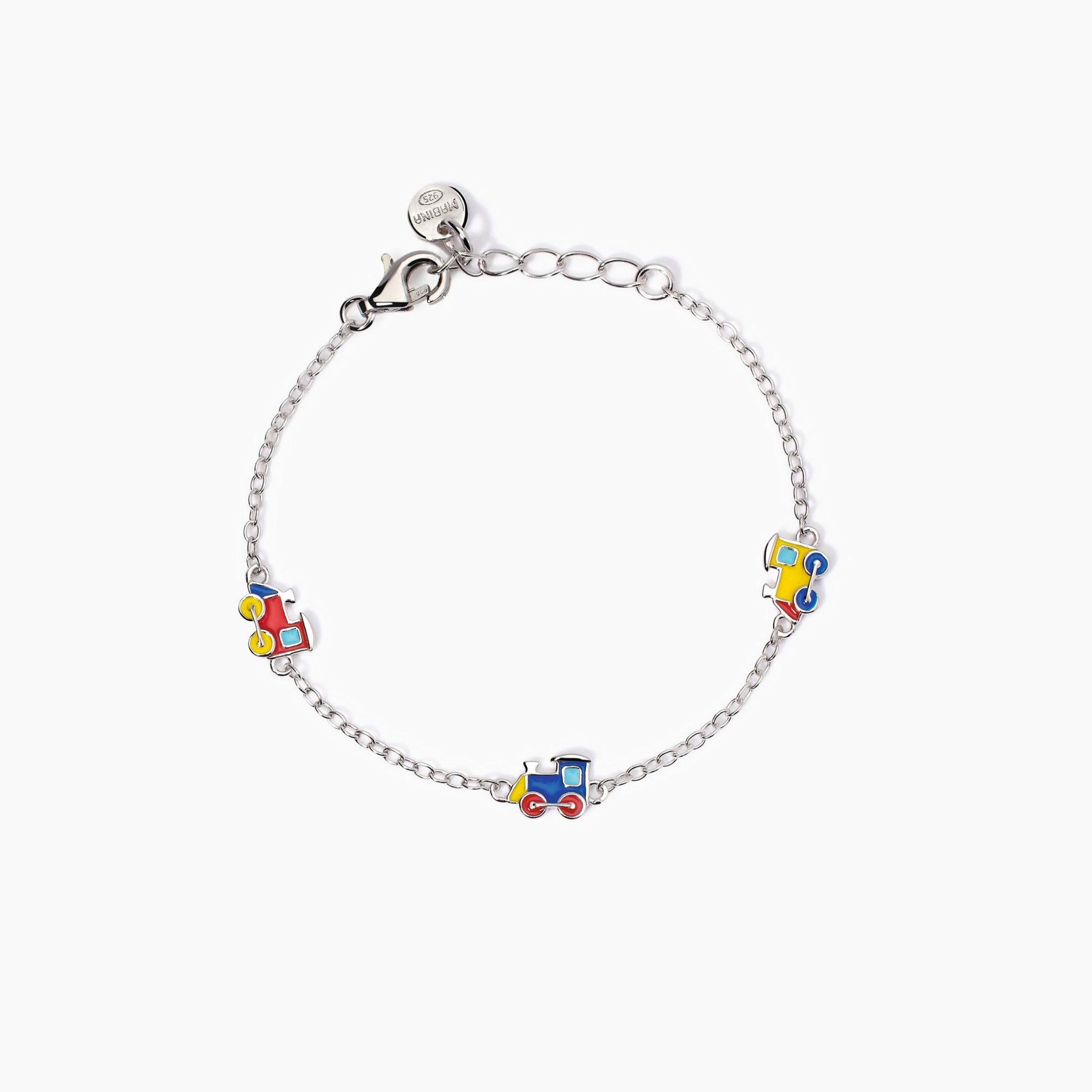 Bracciale regolabile da bambini in argento rodiato con catena rolò ed elementi smaltati a forma di trenino.