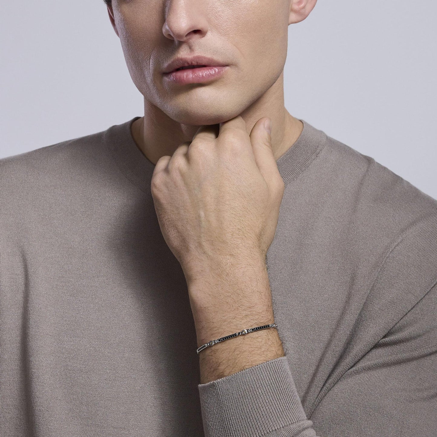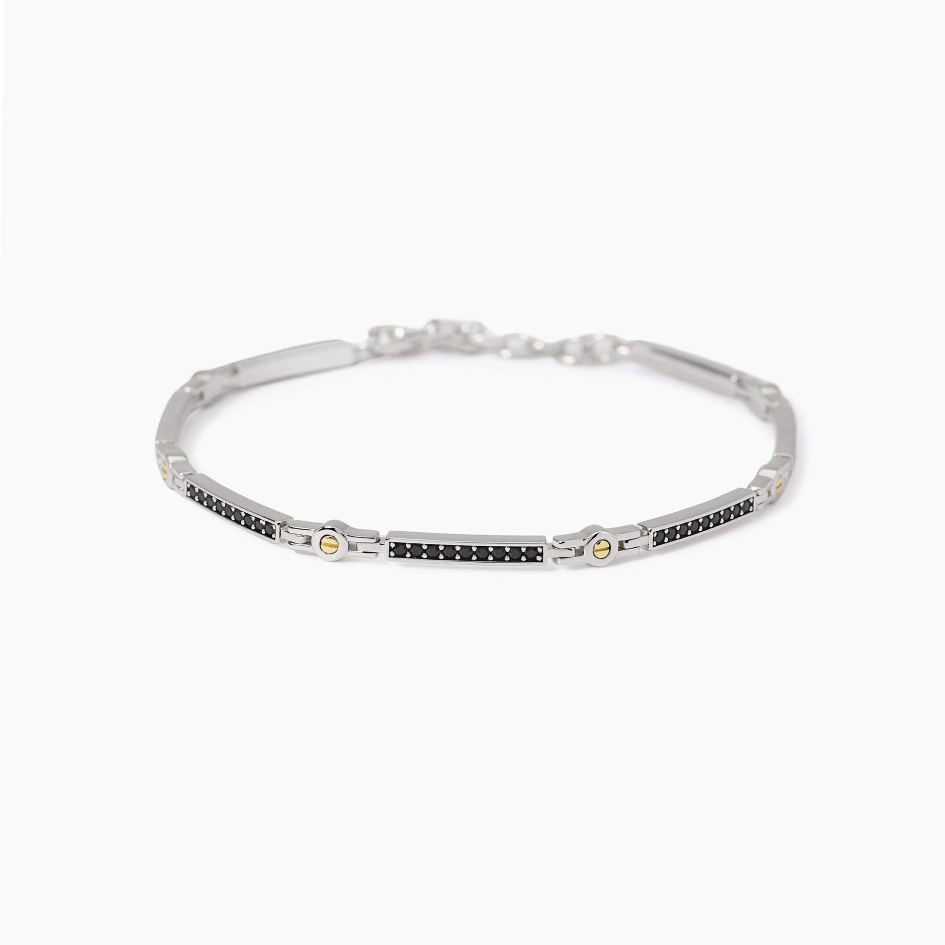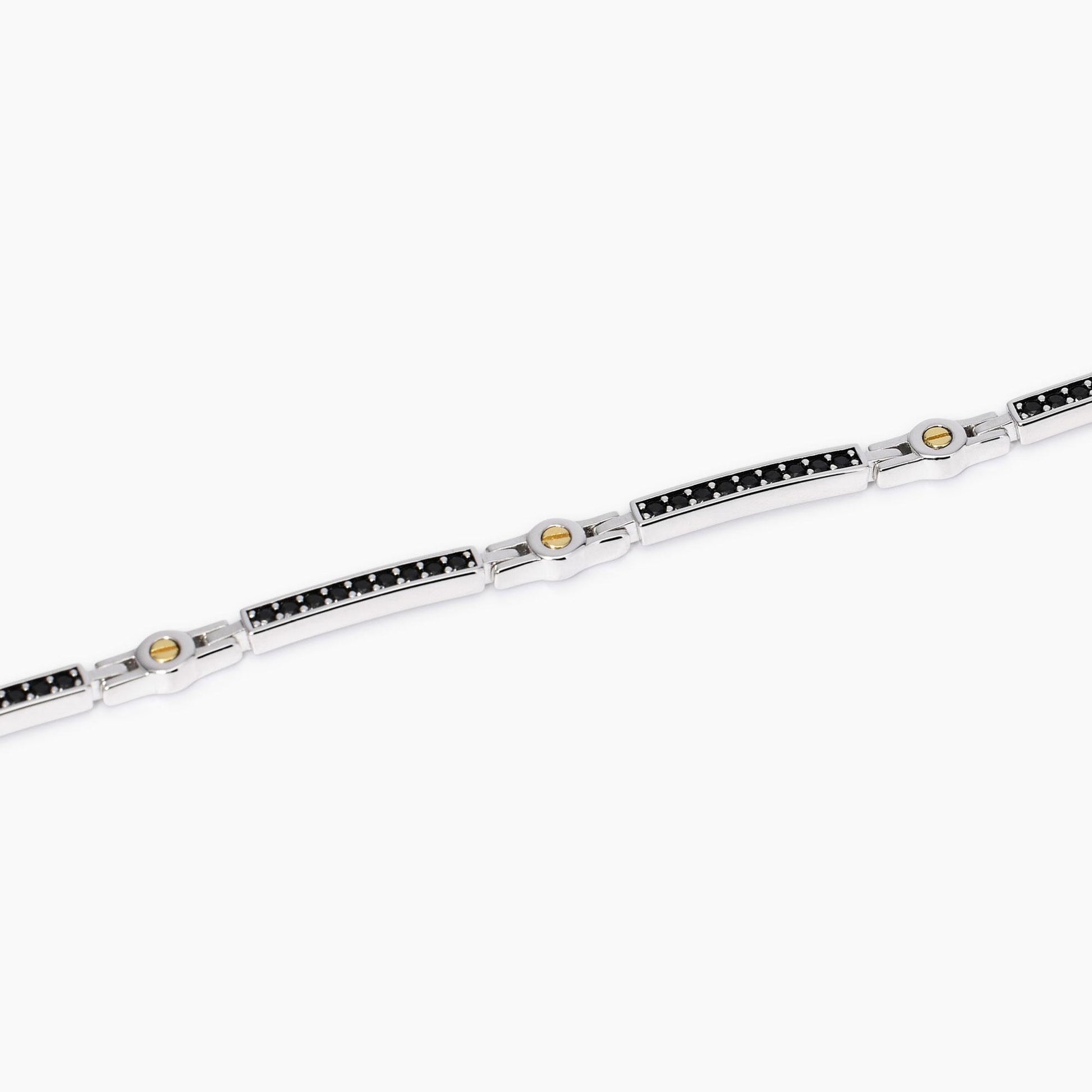 Bracciale regolabile da uomo con dettagli placcati oro e piastre in argento rodiato e zirconi neri.