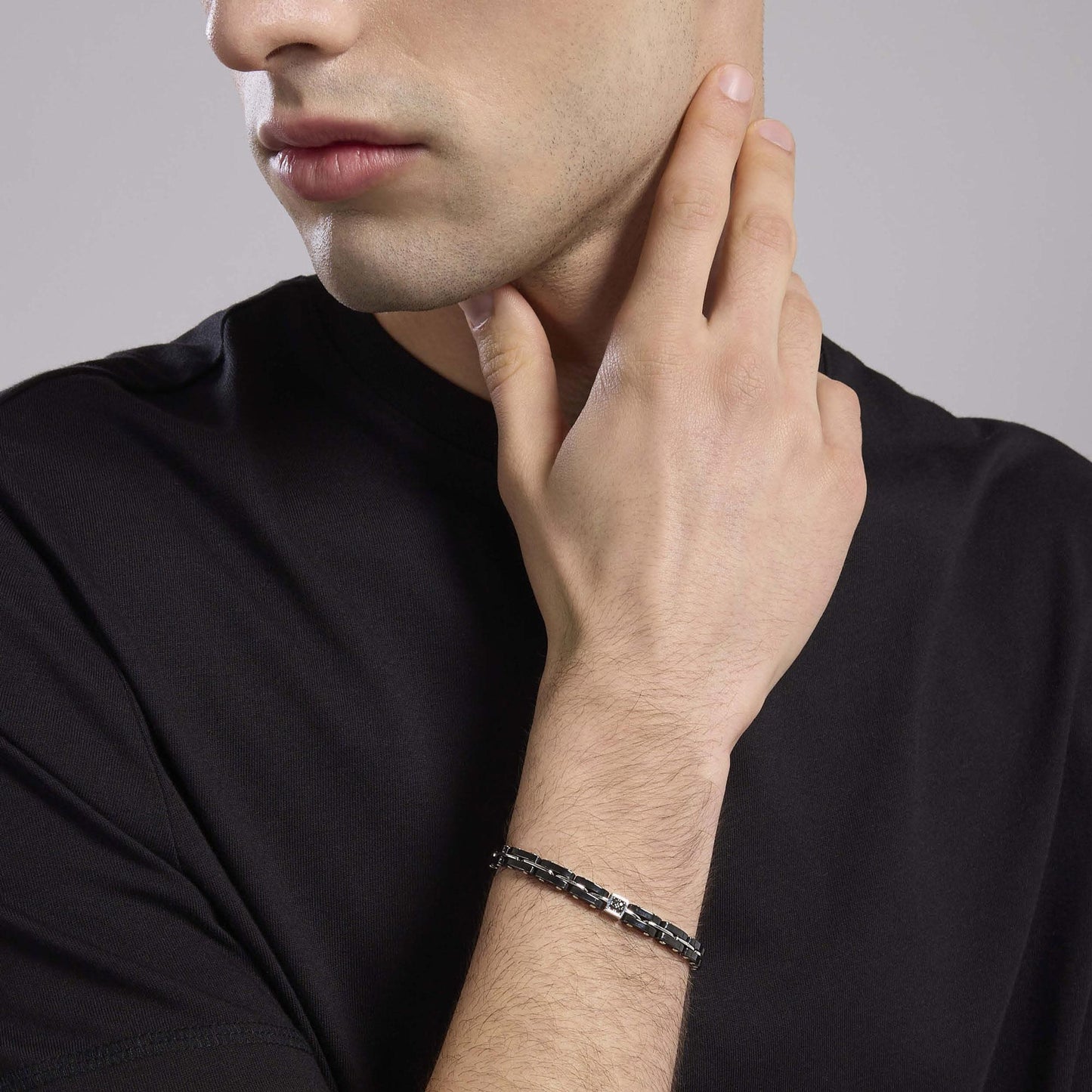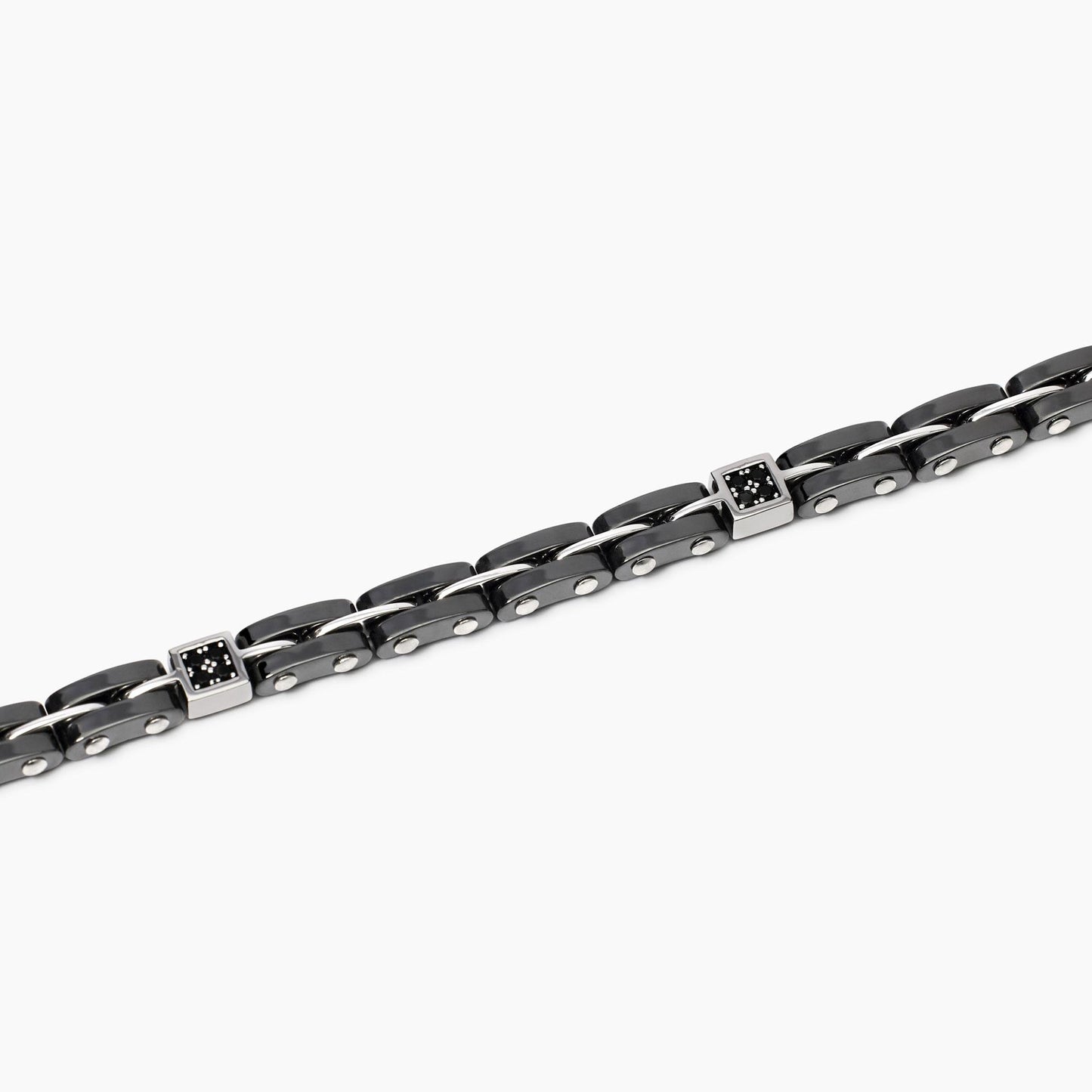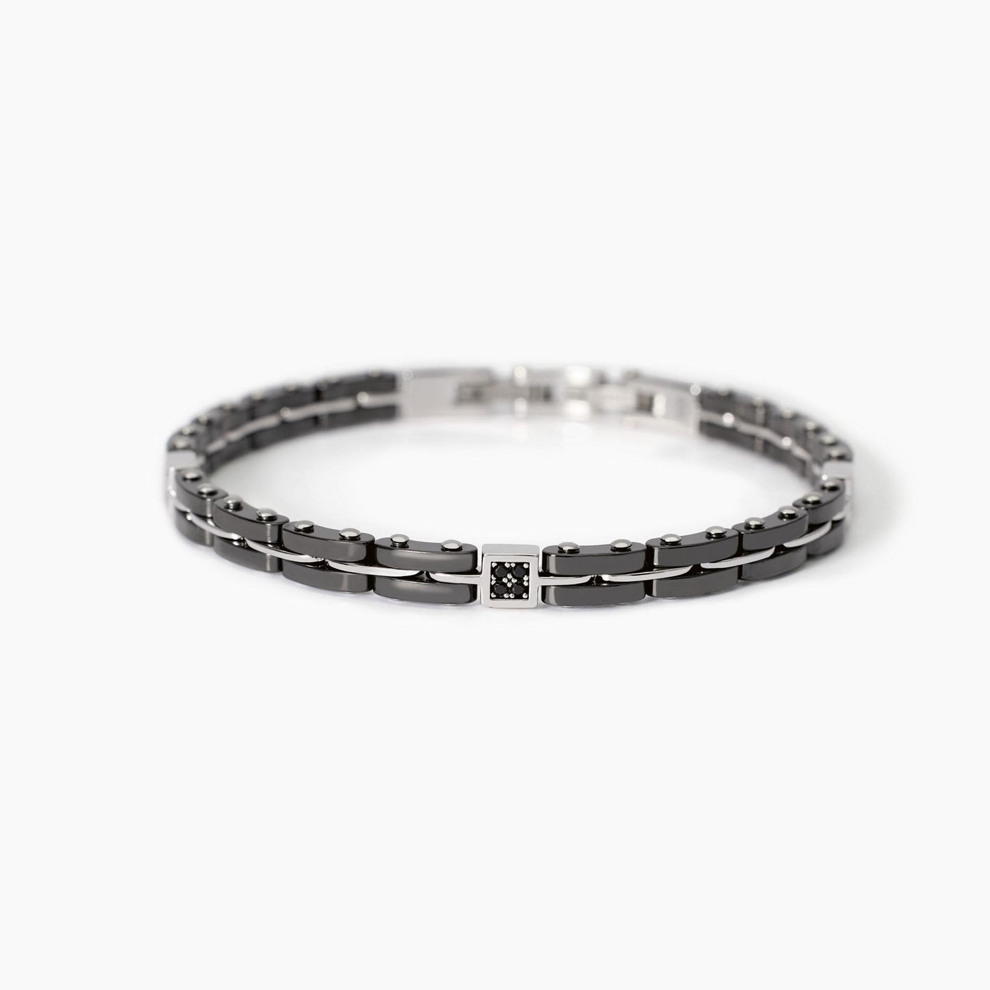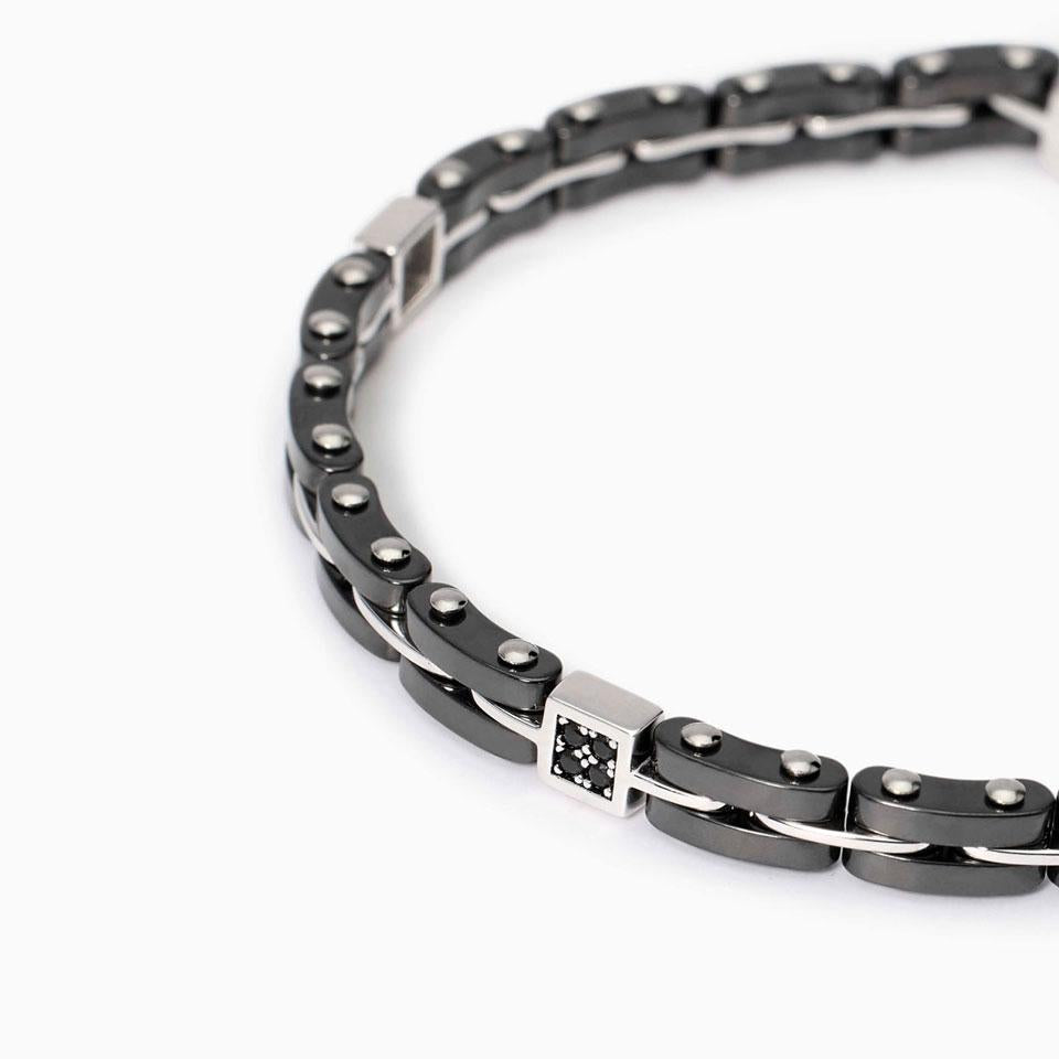 Bracciale con maglie in ceramica grigia e argento con zircone nero centrale. Chiusura in acciaio.