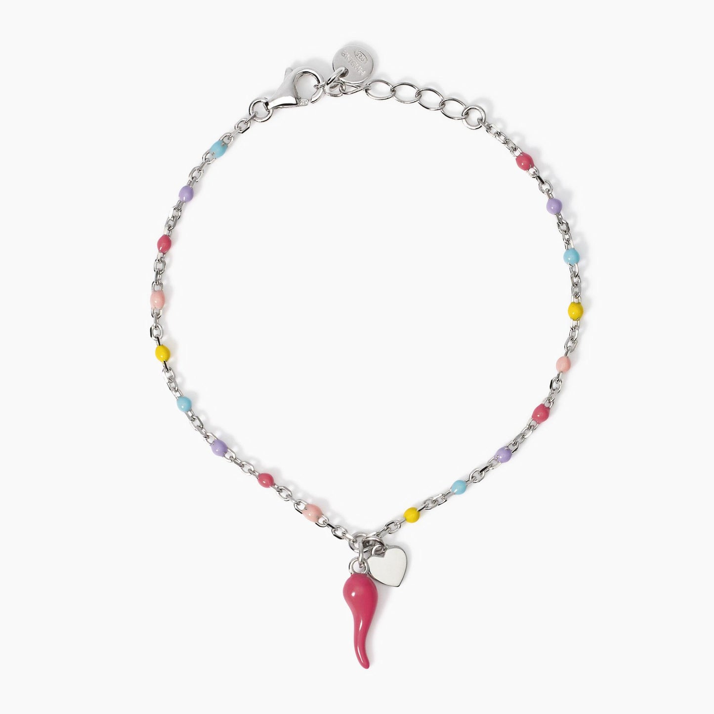 Bracciale in argento rodiato con catena forzatina, inserti smaltati multicolor e cornetto portafortuna smaltato rosa.