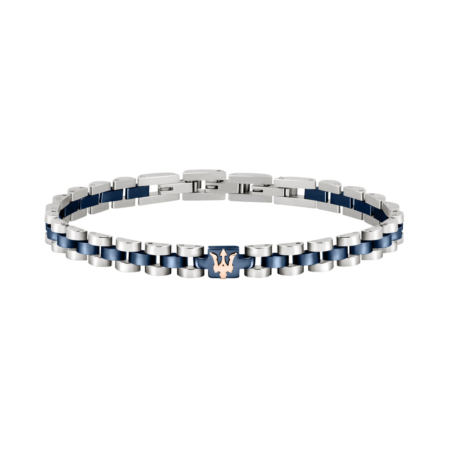 Bracciale realizzato in acciaio bianco e blu e tridente color oro rosa.