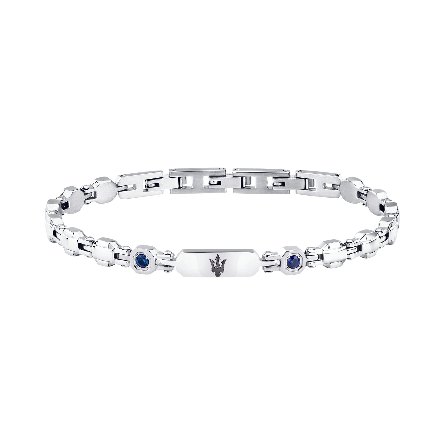 Bracciale realizzato in acciaio con zaffiri lab grown e tridente nero.
