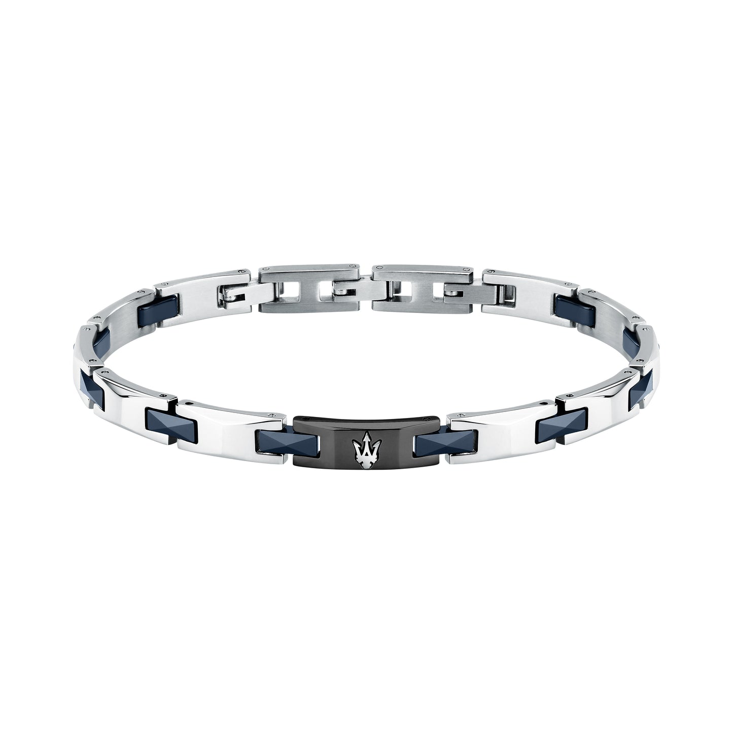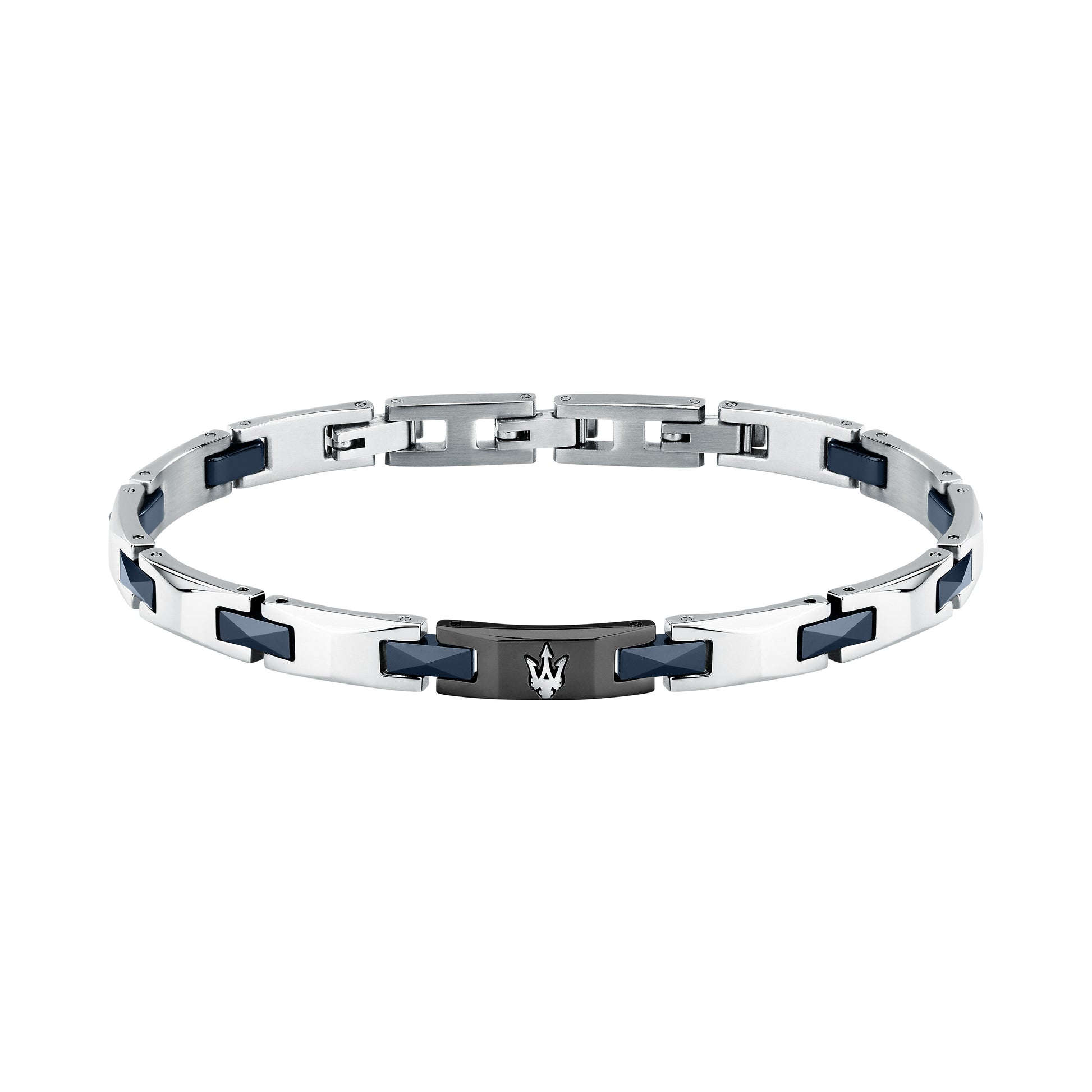 Bracciale realizzato in acciaio con riporti in ceramica blu e piastra centrale nera con tridente.